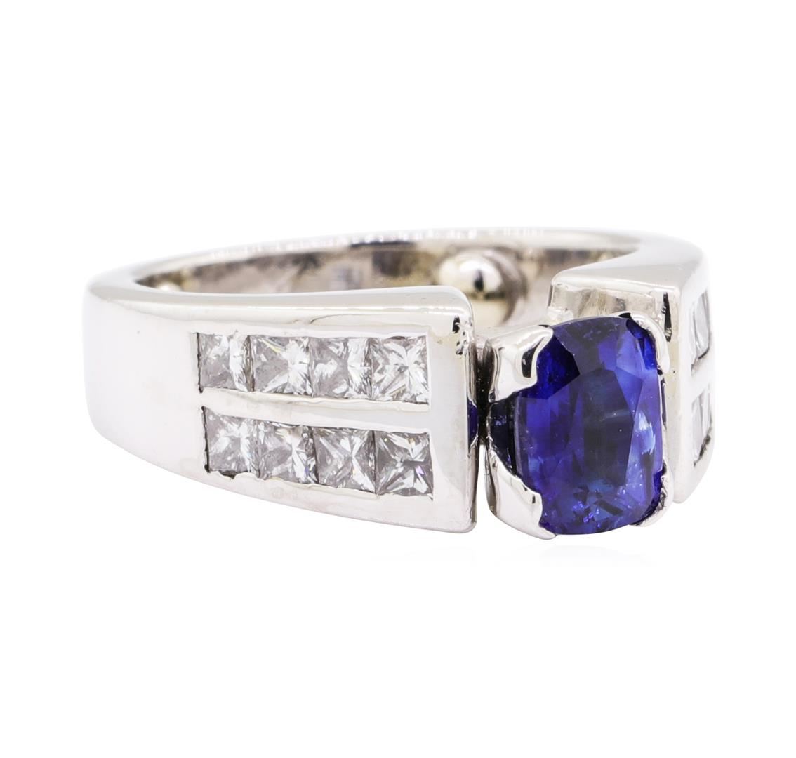 One electronically tested platinum lady's combination cast & assembled fashion ring with a tapered cathedral shank with a bright polish finish. The featured lady's ring has sizing balls and a shank measuring 3.30 millimeters wide. Identified with markings of 'PLAT'. Condition is like new, good workmanship. Containing: One prong set rectangular cushion modified mixed cut natural blue sapphire, measuring 6.69 x 5.30 x 3.25mm, (depth est.) approximate weight of 1.05ct., clarity is slightly included, medium dark, moderately strong, blue color, (GIA B 6/4), cut is good. Transmitting light with a minimum of distortion, transparent. Colored gemstones are presumed to have been subjected to commonly used enhancement processes. Graded in the setting. Sixteen channel set princess cut diamonds, measuring 2.30 x 2.00 x 1.50mm (depth est.) approximate total weight of 16 Stones = 1.00ct. Graded in the setting. Color G - H Clarity SI-1 to SI-2 Cut Very Good. Total Weight of Colored Stones 1.05ct.. Total Weight of Diamonds 1.00ct.. Total Weight of Ring 12.30gm GAS Appraised at $5270.00. GAS Appraised at $5,270.00.