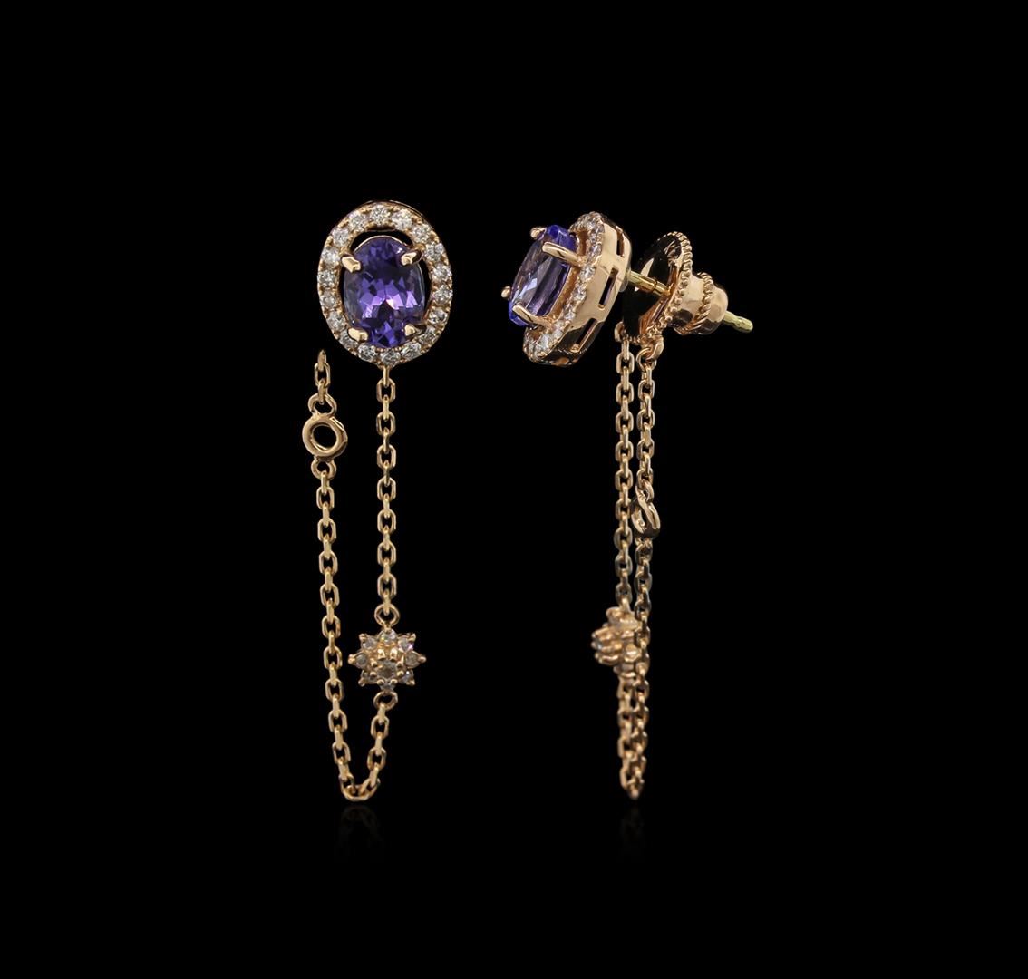 One pair of earrings featuring: 14KT rose gold weighing 5.08 grams containing two tanzanites with a total weight of 2.05ct and 54 diamonds with a total weight of 0.48ct.