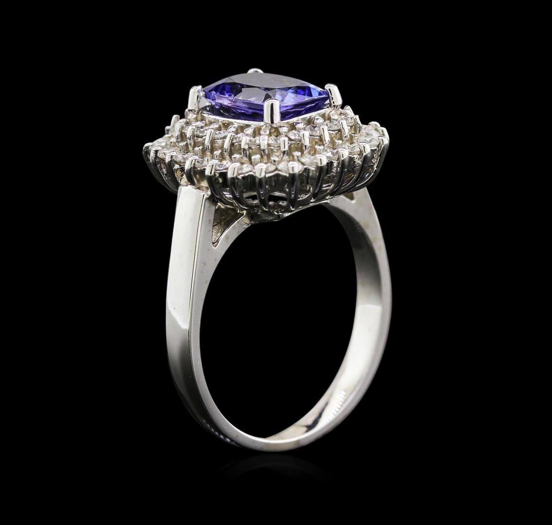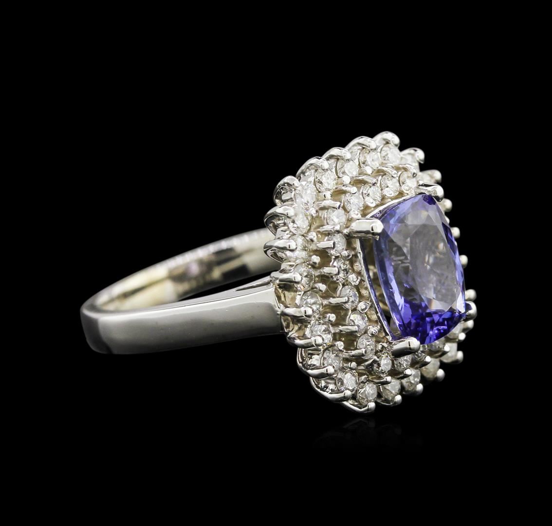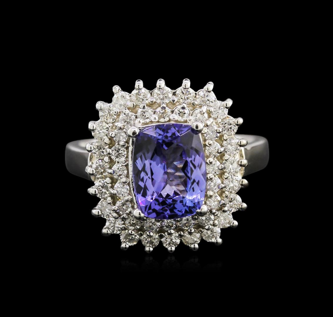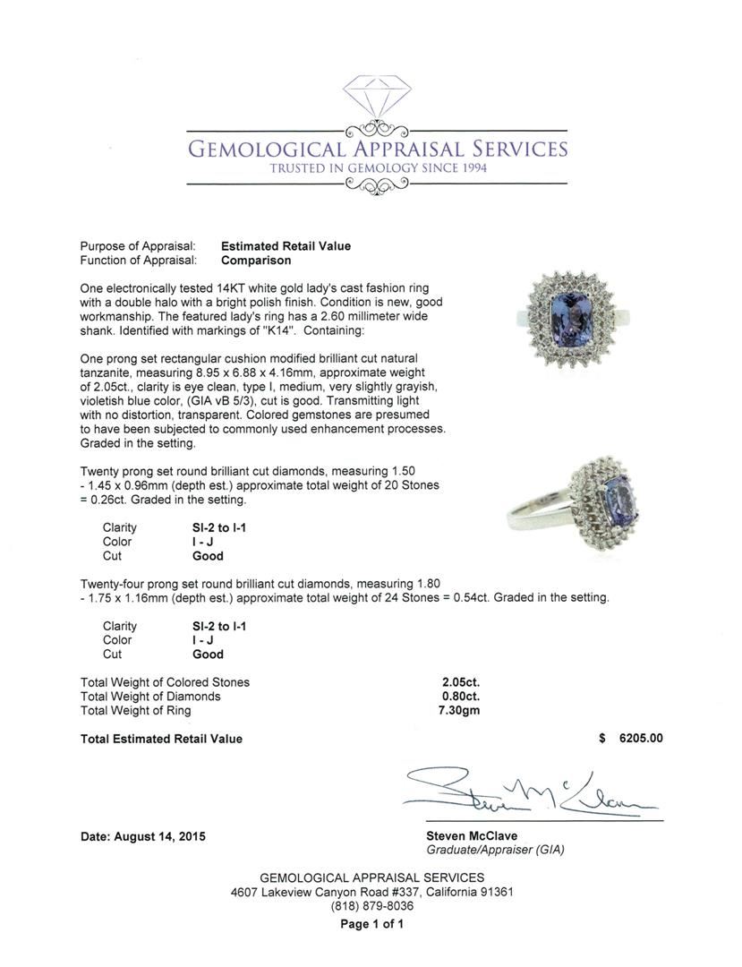 One electronically tested 14KT white gold lady's cast fashion ring with a double halo with a bright polish finish. The featured lady's ring has a 2.60 millimeter wide shank. Identified with markings of "K14". Condition is new, good workmanship. Containing: One prong set rectangular cushion modified brilliant cut natural tanzanite, measuring 8.95 x 6.88 x 4.16mm, approximate weight of 2.05ct., clarity is eye clean, type I, medium, very slightly grayish, violetish blue color, (GIA vB 5/3), cut is good. Transmitting light with no distortion, transparent. Colored gemstones are presumed to have been subjected to commonly used enhancement processes. Graded in the setting. Twenty prong set round brilliant cut diamonds, measuring 1.50 - 1.45 x 0.96mm (depth est.) approximate total weight of 20 Stones = 0.26ct. Graded in the setting. Clarity: SI-2 to I-1. Color: I - Good Twenty-Four prong set round brilliant cut diamonds, measuring 1.80 - 1.75 x 1.16mm (depth est.) approximate total weight of 24 Stones = 0.54ct. Graded in the setting. Clarity: SI-2 to I-1. Color: I - Good. Total Weight of Colored Stones 2.05ct. Total Weight of Diamonds 0.80ct. Total Weight of Ring 7.30gm. GAS Appraised at $6,205.00.