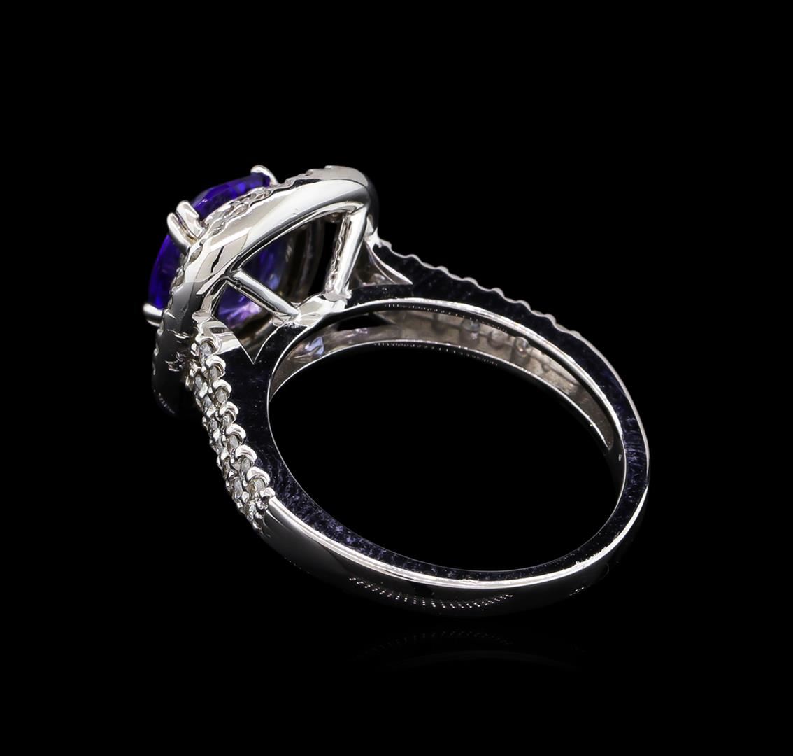 One electronically tested 14KT white gold lady's cast fashion ring with a split shank double halo with a bright polish finish. The featured lady's ring has a shank measuring 2.14 millimeters wide. Identified with markings of "K14". Condition is new, good workmanship. Containing: One prong set rectangular cushion modified brilliant cut natural tanzanite, measuring 8.22 x 7.08 x 4.52mm, approximate weight of 2.05ct., clarity is eye clean, type I, medium, very slightly grayish, bluish violet color, (GIA bV 5/3), cut is very good. Transmitting light with no distortion, transparent. Graded in the setting. Colored gemstones are presumed to have been subjected to commonly used enhancement processes. Twenty-Eight prong set round brilliant cut diamonds, measuring 1.35 - 1.25 x 0.81mm (depth est.) approximate total weight of 28 Stones = 0.24ct. Graded in the setting. Clarity: SI-1 to SI-2. Color: G - H. Cut Good Fifty-Two prong set round brilliant cut diamonds, measuring 1.20 - 1.15 x 0.73mm (depth est.) approximate total weight of 52 Stones = 0.33ct. Graded in the setting. Clarity: SI-1 to I-1. Color: H - I. Cut Good. Total Weight of Colored Stones 2.05ct. Total Weight of Diamonds 0.57ct. Total Weight of Ring 5.50gm. GAS Appraised at $6,205.00.