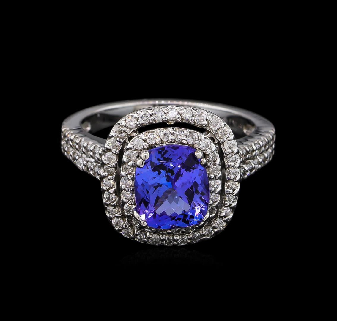 One electronically tested 14KT white gold lady's cast fashion ring with a split shank double halo with a bright polish finish. The featured lady's ring has a shank measuring 2.14 millimeters wide. Identified with markings of "K14". Condition is new, good workmanship. Containing: One prong set rectangular cushion modified brilliant cut natural tanzanite, measuring 8.22 x 7.08 x 4.52mm, approximate weight of 2.05ct., clarity is eye clean, type I, medium, very slightly grayish, bluish violet color, (GIA bV 5/3), cut is very good. Transmitting light with no distortion, transparent. Graded in the setting. Colored gemstones are presumed to have been subjected to commonly used enhancement processes. Twenty-Eight prong set round brilliant cut diamonds, measuring 1.35 - 1.25 x 0.81mm (depth est.) approximate total weight of 28 Stones = 0.24ct. Graded in the setting. Clarity: SI-1 to SI-2. Color: G - H. Cut Good Fifty-Two prong set round brilliant cut diamonds, measuring 1.20 - 1.15 x 0.73mm (depth est.) approximate total weight of 52 Stones = 0.33ct. Graded in the setting. Clarity: SI-1 to I-1. Color: H - I. Cut Good. Total Weight of Colored Stones 2.05ct. Total Weight of Diamonds 0.57ct. Total Weight of Ring 5.50gm. GAS Appraised at $6,205.00.