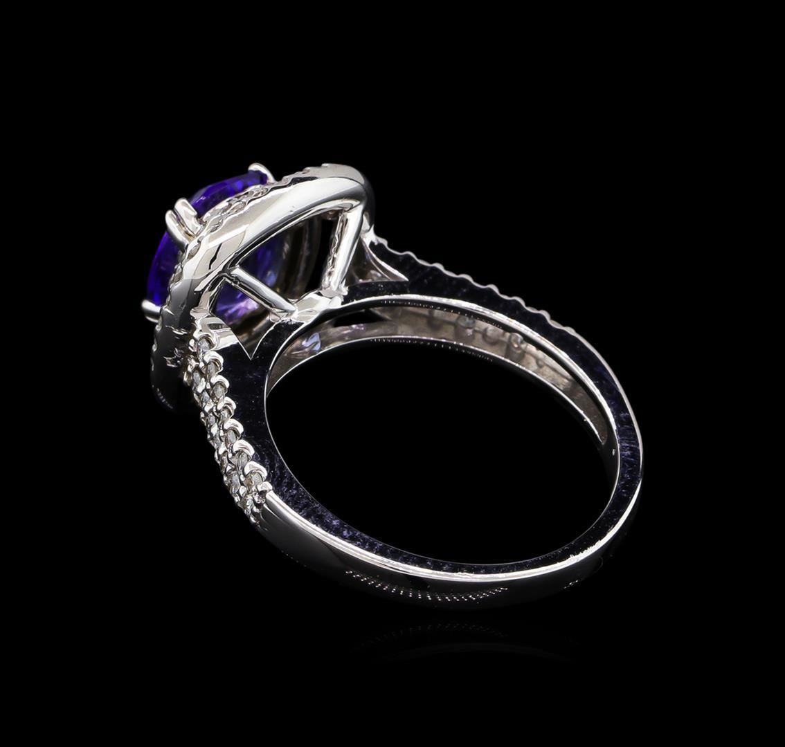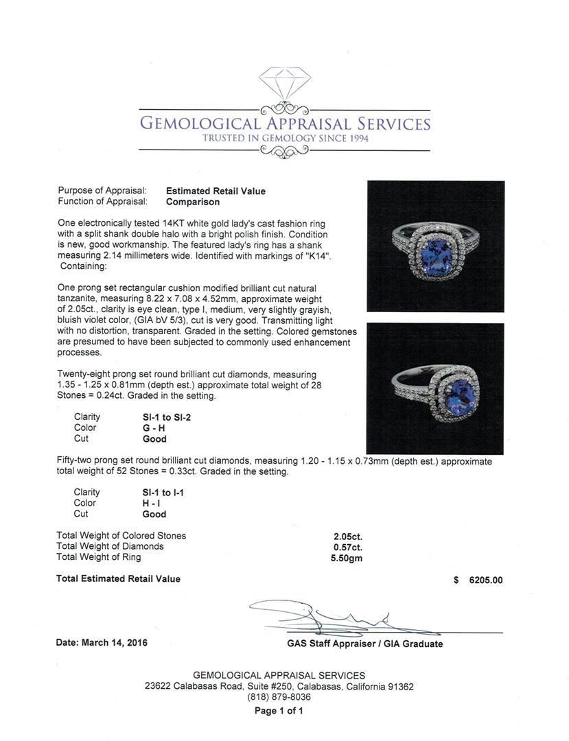 One electronically tested 14KT white gold lady's cast fashion ring with a split shank double halo with a bright polish finish. The featured lady's ring has a shank measuring 2.14 millimeters wide. Identified with markings of "K14". Condition is new, good workmanship. Containing: One prong set rectangular cushion modified brilliant cut natural tanzanite, measuring 8.22 x 7.08 x 4.52mm, approximate weight of 2.05ct., clarity is eye clean, type I, medium, very slightly grayish, bluish violet color, (GIA bV 5/3), cut is very good. Transmitting light with no distortion, transparent. Graded in the setting. Colored gemstones are presumed to have been subjected to commonly used enhancement processes. Twenty-Eight prong set round brilliant cut diamonds, measuring 1.35 - 1.25 x 0.81mm (depth est.) approximate total weight of 28 Stones = 0.24ct. Graded in the setting. Clarity: SI-1 to SI-2. Color: G - H. Cut Good Fifty-Two prong set round brilliant cut diamonds, measuring 1.20 - 1.15 x 0.73mm (depth est.) approximate total weight of 52 Stones = 0.33ct. Graded in the setting. Clarity: SI-1 to I-1. Color: H - I. Cut Good. Total Weight of Colored Stones 2.05ct. Total Weight of Diamonds 0.57ct. Total Weight of Ring 5.50gm. GAS Appraised.