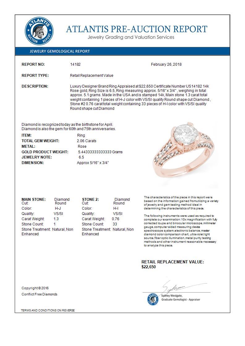 REF-485M8H -14182 ---- 2.06 CTW Certified VS/SI Diamond Ring 14K Rose Gold ---- Luxury Designer Brand Ring Appraised at $22,650 Certificate Number US14182 14k Rose gold, Ring Size is 6.5, Ring measuring approx. 5/16" x 3/4" , weighing in total approx. 5.1 grams. Made in the USA and is stamped 14k, Main stone 1.3 carat total weight containing 1 pieces of H-J color with VS/SI quality Round shape cut Diamond , Stone #2 0.76 carat total weight containing 33 pieces of H-I color with VS/SI quality Round shape cut Diamond