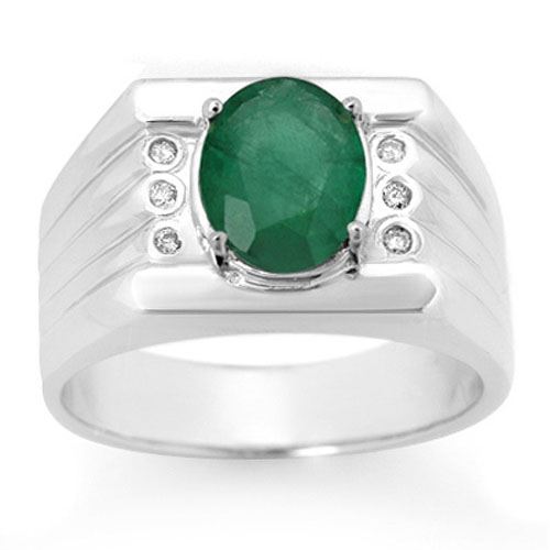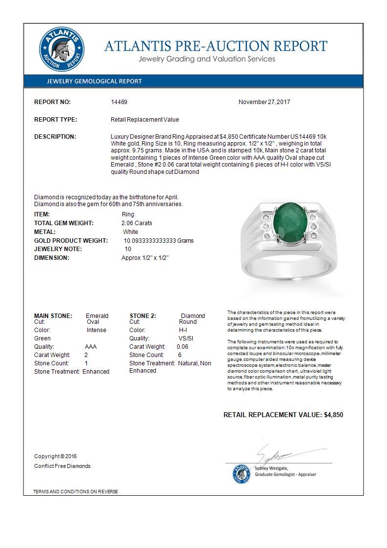 REF-73T8M -14469 ---- 2.06 CTW Emerald & Diamond Men's Ring 10K White Gold ---- Luxury Designer Brand Ring Appraised at $4,850 Certificate Number US14469 10k White gold, Ring Size is 10, Ring measuring approx. 1/2" x 1/2" , weighing in total approx. 9.75 grams. Made in the USA and is stamped 10k, Main stone 2 carat total weight containing 1 pieces of Intense Green color with AAA quality Oval shape cut Emerald , Stone #2 0.06 carat total weight containing 6 pieces of H-I color with VS/SI quality Round shape cut Diamond