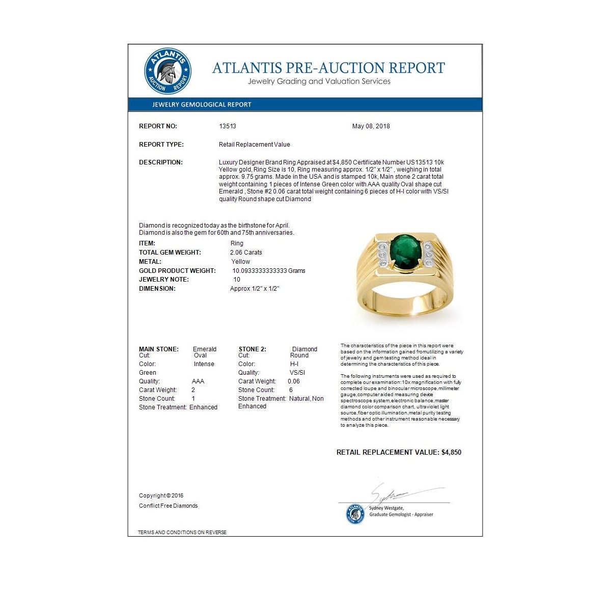 REF-73A8X -13513 ---- 2.06 CTW Emerald & Diamond Men's Ring 10K Yellow Gold ---- Luxury Designer Brand Ring Appraised at $4,850 Certificate Number US13513 10k Yellow gold, Ring Size is 10, Ring measuring approx. 1/2" x 1/2" , weighing in total approx. 9.75 grams. Made in the USA and is stamped 10k, Main stone 2 carat total weight containing 1 pieces of Intense Green color with AAA quality Oval shape cut Emerald , Stone #2 0.06 carat total weight containing 6 pieces of H-I color with VS/SI quality Round shape cut Diamond