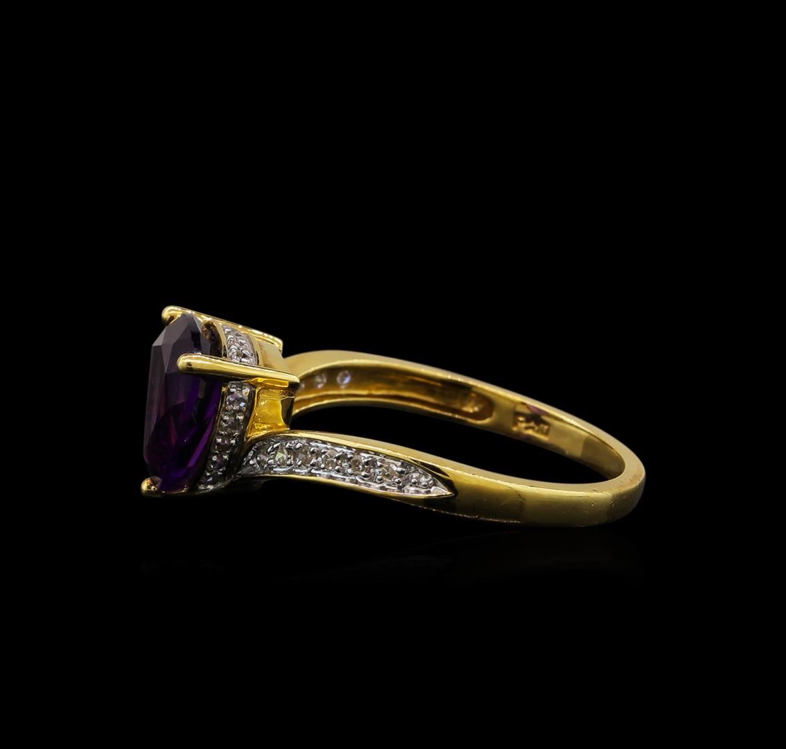 One electronically tested 14KT yellow gold ladies cast amethyst and diamond ring. The featured amethyst is set within a diamond accented basket and supported by diamond set chevron style shoulders, completed by one and one-half millimeter wide band. Bright polish finish with rhodium accents. Identified with markings of '14K'. Condition is good. Containing: One prong set triangle mixed cut natural amethyst, measuring 9.00 x 9.00 x 4.95mm, 6%. bulge factor, approximate weight of 2.06ct., clarity is slightly included, type II, medium dark, moderately strong, purple color, (GIA P 6/4), cut is good. Transmitting light with a minimum of distortion, transparent. Naturally occurring internal & external characteristics are present. Graded in the setting. Twenty-Seven bead set single cut diamonds, measuring 1.00 - 0.90 x 0.57mm (depth est.) approximate total weight of 27 Stones = 0.10ct. Graded in the setting. Clarity SI-2 to I-1. Color: H - J. Total Weight of Colored Stones 2.06ct.. Total Weight of Diamonds 0.10ct.. Total Weight of Ring 2.65gm. AIG Appraised at $920.00.