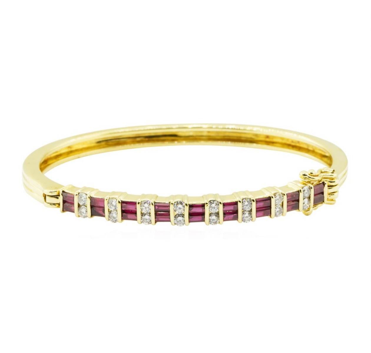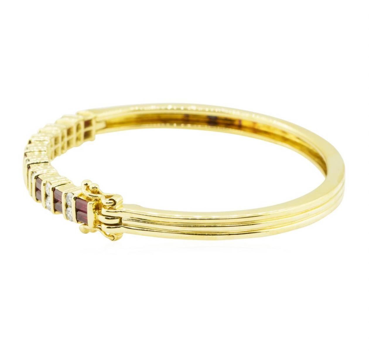 One electronically tested 18KT yellow gold lady's combination cast & assembled fashion bangle bracelet with a tongue clasp with double foldover safeties with a straight line motif with a bright polish finish. The featured lady's bracelet has a width of 4.40 millimeters and a circumference of 6.5 inches. Trademark is gem lok. Condition is new, good workmanship. Containing: Eighteen channel set baguette standard step cut natural rubies, measuring 3.10 x 1.75 x 1.14mm, (depth est.) approximate total weight of 1.26ct., clarity is eye clean, medium, strong, slightly purplish red color, (GIA slpR 5/5), cut is very good. Transmitting light with no distortion, transparent. Colored gemstones are presumed to have been subjected to commonly used enhancement processes. Graded in the setting. Sixteen channel set round brilliant cut diamonds, measuring 2.35 - 2.30 x 1.44mm (depth est.) approximate total weight of 16 Stones = 0.80ct. Graded in the setting. Color F - G Clarity VS-1 to VS-2 Cut Excellent. Total Weight of Colored Stones 1.26ct.. Total Weight of Diamonds 0.80ct.. Total Weight of Bracelet 25.40gm GAS Appraised at $8500.00. GAS Appraised.