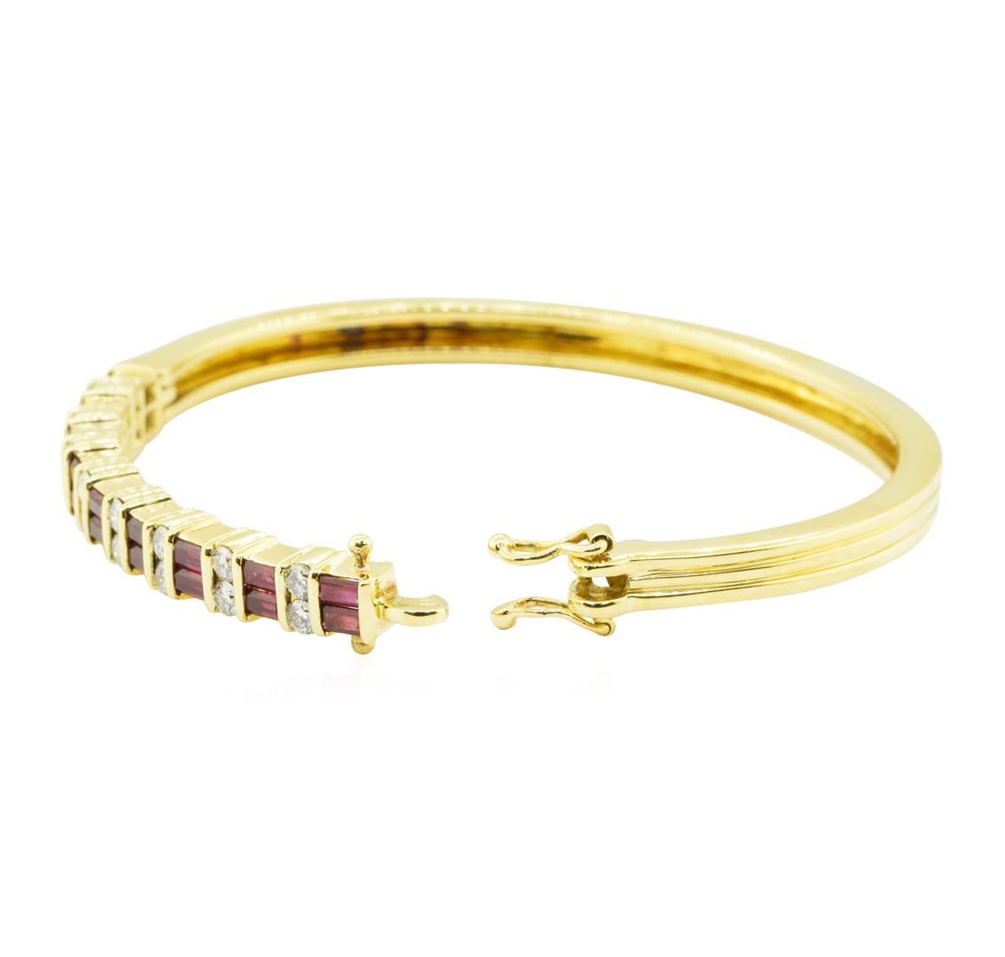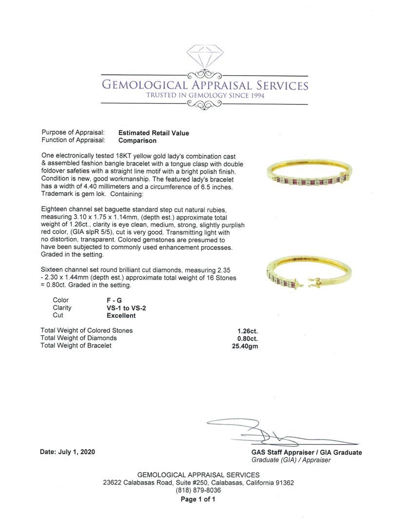 One electronically tested 18KT yellow gold lady's combination cast & assembled fashion bangle bracelet with a tongue clasp with double foldover safeties with a straight line motif with a bright polish finish. The featured lady's bracelet has a width of 4.40 millimeters and a circumference of 6.5 inches. Trademark is gem lok. Condition is new, good workmanship. Containing: Eighteen channel set baguette standard step cut natural rubies, measuring 3.10 x 1.75 x 1.14mm, (depth est.) approximate total weight of 1.26ct., clarity is eye clean, medium, strong, slightly purplish red color, (GIA slpR 5/5), cut is very good. Transmitting light with no distortion, transparent. Colored gemstones are presumed to have been subjected to commonly used enhancement processes. Graded in the setting. Sixteen channel set round brilliant cut diamonds, measuring 2.35 - 2.30 x 1.44mm (depth est.) approximate total weight of 16 Stones = 0.80ct. Graded in the setting. Color F - G Clarity VS-1 to VS-2 Cut Excellent. Total Weight of Colored Stones 1.26ct.. Total Weight of Diamonds 0.80ct.. Total Weight of Bracelet 25.40gm GAS Appraised at $8500.00. GAS Appraised.