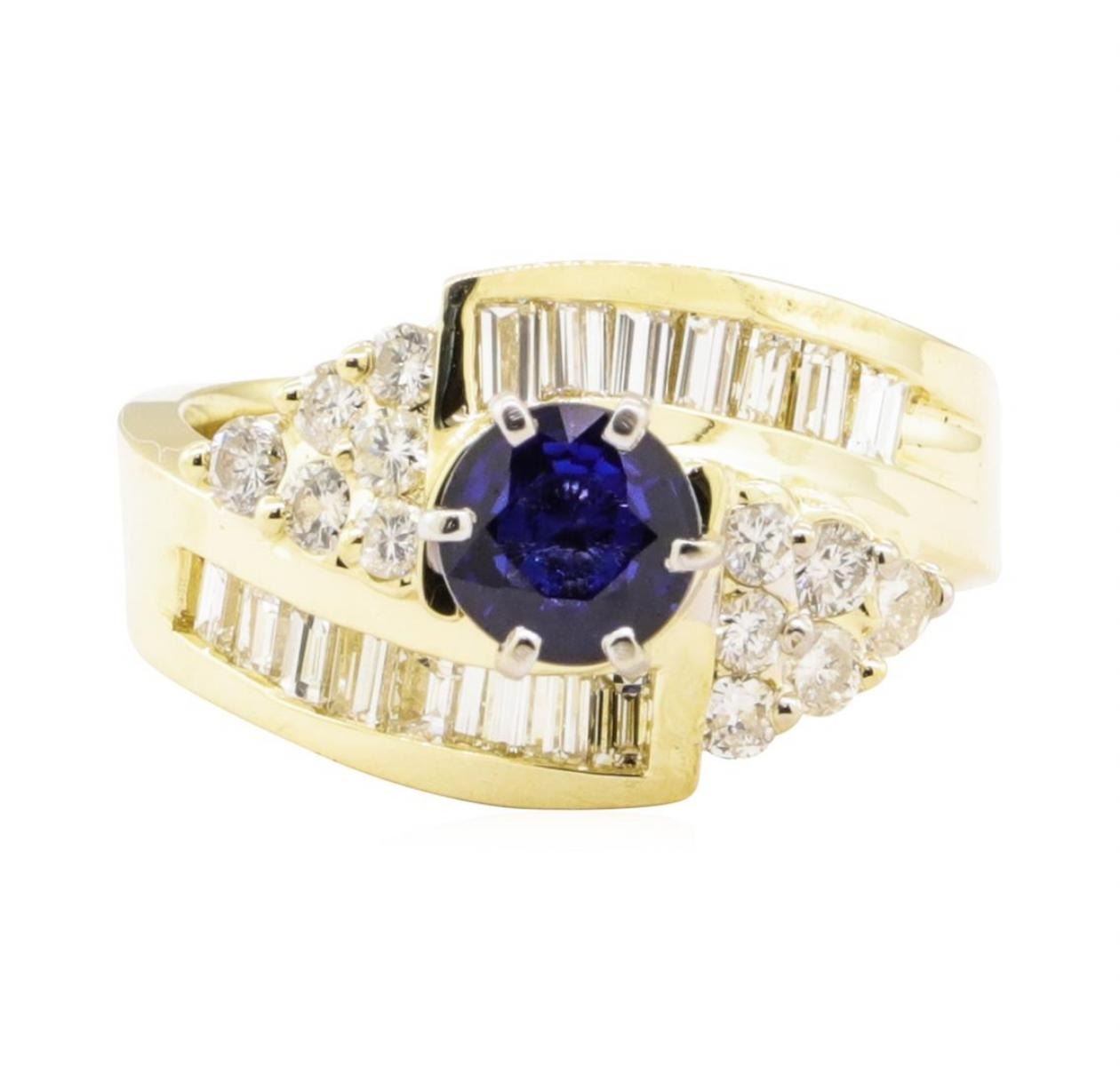 One electronically tested 14KT yellow gold lady's combination cast & assembled fashion ring with a bypass cluster motif with a bright polish finish. The featured lady's ring has a shank measuring 4.20 millimeters wide. Identified with markings of '14K'. Condition is new, good workmanship. Containing: One prong set round modified mixed cut natural blue sapphire, measuring 5.90 - 5.86 x 3.60 mm, (depth est.) approximate weight of 0.96ct., clarity is slightly included, medium dark, moderately strong, blue color, (GIA B 6/4), cut is good. Transmitting light with a minimum of distortion, transparent. Colored gemstones are presumed to have been subjected to commonly used enhancement processes. Graded in the setting. Fourteen channel set baguette cut diamonds, measuring from 2.20 x 1.40 x 1.19mm (depth est.) to 2.60 x 1.60 x 1.36mm (depth est.) approximate total weight of 14 Stones = 0.60 ct. Graded in the setting. Color H - I Clarity VS-1 to VS-2 Cut Very Good Twelve channel and prong set round brilliant cut diamonds, measuring 2.40 - 2.00 x 1.36mm (depth est.) approximate total weight of 12 Stones = 0.50 ct. Graded in the setting. Color H - I Clarity SI-1 to SI-2 Cut Good. Total Weight of Colored Stones 0.96ct.. Total Weight of Diamonds 1.10 ct.. Total Weight of Ring 9.00gm GAS Appraised at $5080.00. GAS Appraised.