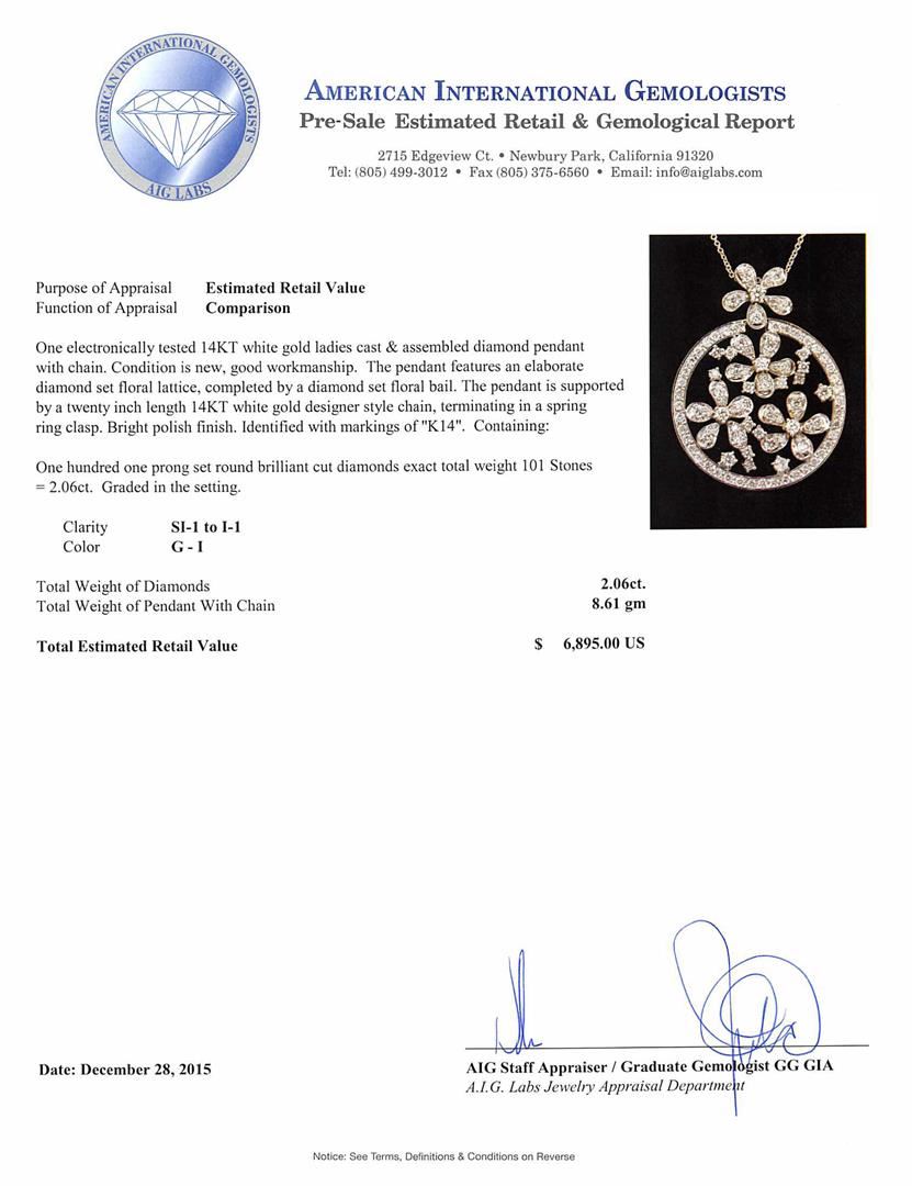 One electronically tested 14KT white gold ladies cast & assembled diamond pendant with chain. The pendant features an elaborate diamond set floral lattice, completed by a diamond set floral bail. The pendant is supported by a twenty inch length 14KT white gold designer style chain, terminating in a spring ring clasp. Bright polish finish. Identified with markings of "K14". Condition is new, good workmanship. Containing: One Hundred One prong set round brilliant cut diamonds exact total weight 101 Stones = 2.06ct. Graded in the setting. Clarity: SI-1 to I-1. Color: G - I. Total Weight of Diamonds 2.06ct. Total Weight of Pendant With Chain 8.61gm. AIG Appraised at $6,895.00.