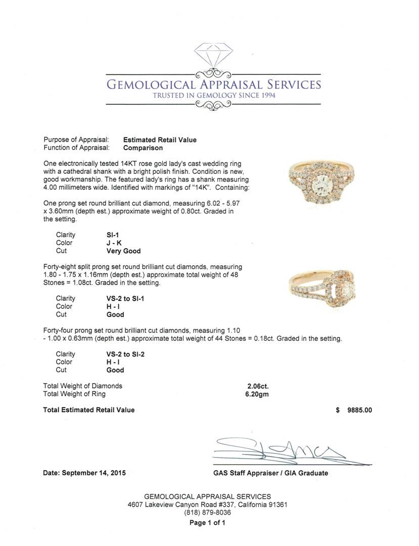 One electronically tested 14KT rose gold lady's cast wedding ring with a cathedral shank with a bright polish finish. The featured lady's ring has a shank measuring 4.00 millimeters wide. Identified with markings of "14K". Condition is new, good workmanship. Containing: One prong set round brilliant cut diamond, measuring 6.02 - 5.97 x 3.60mm (depth est.) approximate weight of 0.80ct. Graded in the setting. Clarity: SI-1. Color: J - K. Cut Very Good Forty-Eight split prong set round brilliant cut diamonds, measuring 1.80 - 1.75 x 1.16mm (depth est.) approximate total weight of 48 Stones = 1.08ct. Graded in the setting. Clarity: VS-2 to SI-1. Color: H - I. Cut Good Forty-Four prong set round brilliant cut diamonds, measuring 1.10 - 1.00 x 0.63mm (depth est.) approximate total weight of 44 Stones = 0.18ct. Graded in the setting. Clarity: VS-2 to SI-2. Color: H - I. Cut Good. Total Weight of Diamonds 2.06ct. Total Weight of Ring 6.20gm. GAS Appraised at $9,885.00.