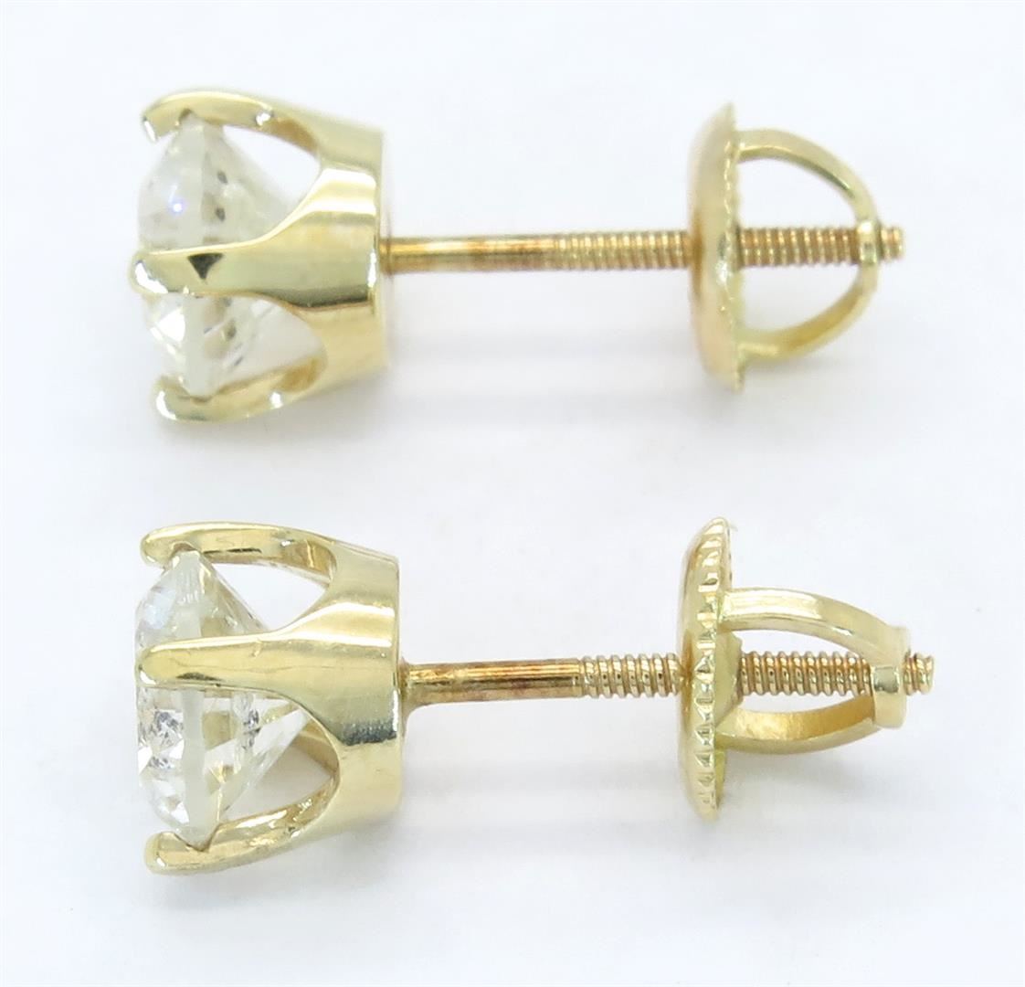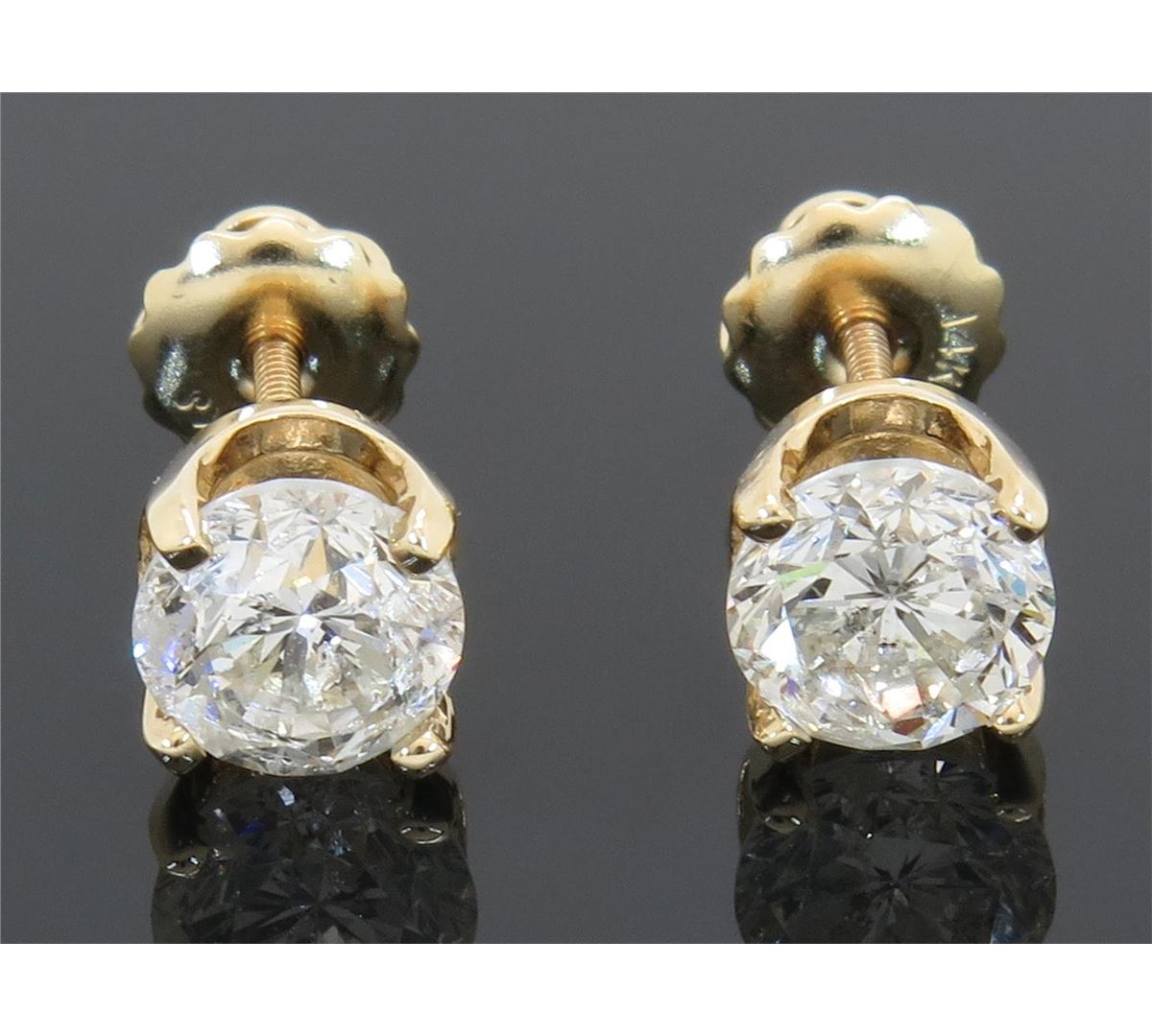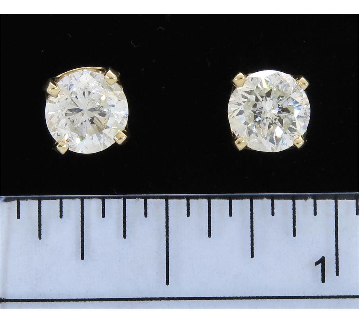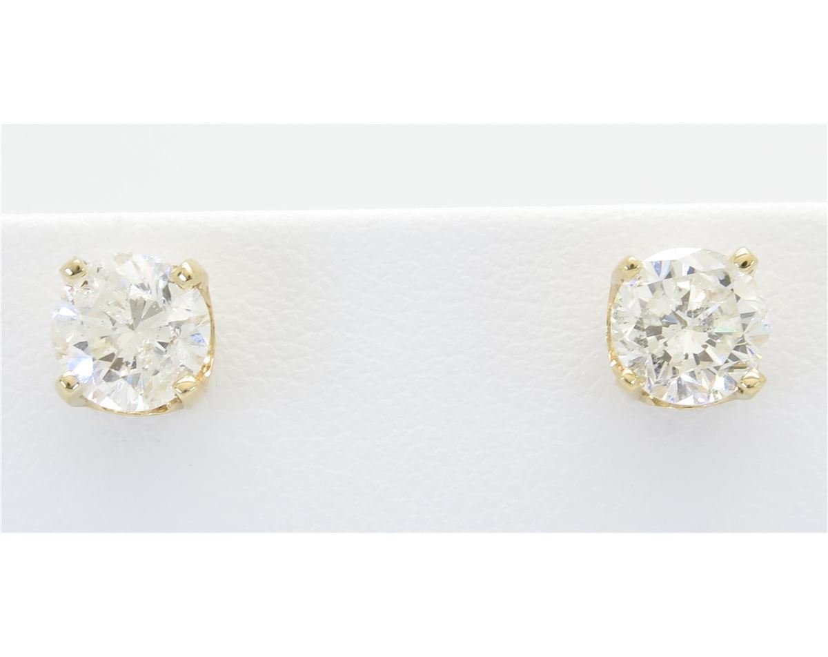 Two tested 14K yellow gold diamond stud earrings. Condition is new. Containing: Two Round Brilliant Cut Diamonds. Clarity: I, Color: H-I. Approximate total diamond weight: 2.06CTW. Diamonds are graded in the mounting, unless otherwise stated. Weight of earrings: 2.0 grams.
