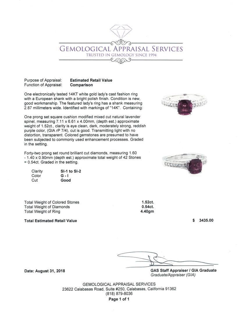 One electronically tested 14KT white gold lady's cast fashion ring with a European shank with a bright polish finish. The featured lady's ring has a shank measuring 2.87 millimeters wide. Identified with markings of '14K'. Condition is new, good workmanship. Containing: One prong set square cushion modified mixed cut natural lavender spinel, measuring 7.11 x 6.61 x 4.00mm, (depth est.) approximate weight of 1.52ct., clarity is eye clean, dark, moderately strong, reddish purple color, (GIA rP 7/4), cut is good. Transmitting light with no distortion, transparent. Colored gemstones are presumed to have been subjected to commonly used enhancement processes. Graded in the setting. Forty-Two prong set round brilliant cut diamonds, measuring 1.60 - 1.40 x 0.90mm (depth est.) approximate total weight of 42 Stones = 0.54ct. Graded in the setting. Color G - I Clarity SI-1 to SI-2 Cut Good. Total Weight of Colored Stones 1.52ct.. Total Weight of Diamonds 0.54ct.. Total Weight of Ring 4.40gm GAS Appraised at $3435.00. GAS Appraised at $3,435.00.