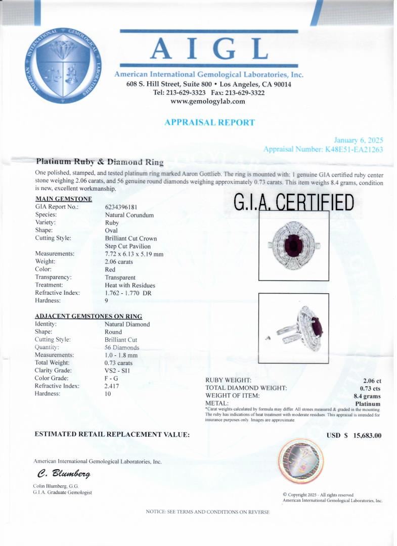 One polished, stamped, and tested platinum ring marked Aaron Gottlieb. The ring is mounted with: 1 genuine GIA certified ruby center stone weighing 2.06 carats, and 56 genuine round diamonds weighing approximately 0.73 carats. This item weighs 8.4 grams, condition is new, excellent workmanship. #MAIN GEMSTONE# GIA Report No.2 6234396181; Species: Natural Corundum; Variety: Ruby; Shape: Oval; Cutting Style: Brilliant Cut Crown, Step Cut Pavilion; Measurements: 7.72 x 6.13 x 5.19mm; Weight: 2.06 carats; Color: Red; Transparency: Transparent; Treatment: Heat with Residues; Refractive Index: 1.762 - 1.770 DR; Hardness: 9 #ADJACENT GEMSTONES ON RING# Identity: Natural Diamond; Shape: Round; Cutting Style: Brilliant Cut; Quantity: 56 Diamonds; Measurements: 1.0 - 1.8mm; Total Weight: 0.73 carats; Clarity Grade: VS2-SI1; Color Grade: F-G; Refractive Index: 2.417; Hardness: 10 #RUBY WEIGHT: 2.06 ct; TOTAL DIAMOND WEIGHT: 0.73 cts; WEIGHT OF ITEM: 8.4 grams; METAL: Platinum #Size: 6 1/2
