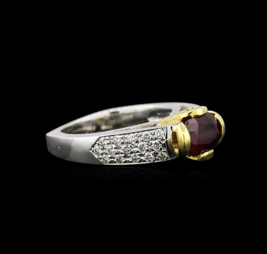 One electronically tested 18KT white and yellow gold lady's combination cast & assembled fashion ring with a bright polish finish. The featured lady's ring has a shank measuring 2.98 millimeters wide. Identified with markings of "18K". Condition is new, good workmanship. Containing: One prong set oval modified brilliant cut natural ruby, measuring 8.30 x 5.50 x 5.00mm, 5% bulge factor, approximate weight of 2.06ct., clarity is heavily included, type II, dark, very slightly brownish, orangy red color, (GIA oR 7/3), cut is good. Transmitting light somewhat diffusely, semi-transparent to translucent. Indications of laboratory high temperature heat treatment, with glass & flux additives. Graded in the setting. Thirty bead set round brilliant cut diamonds, measuring 1.60 - 1.55 x 1.03mm (depth est.) approximate total weight of 30 Stones = 0.48ct. Graded in the setting. Clarity: VS-2 to SI-2. Color: G - Good. Total Weight of Colored Stones 2.06ct. Total Weight of Diamonds 0.48ct. Total Weight of Ring 9.40gm. GAS Appraised at $4,325.00.
