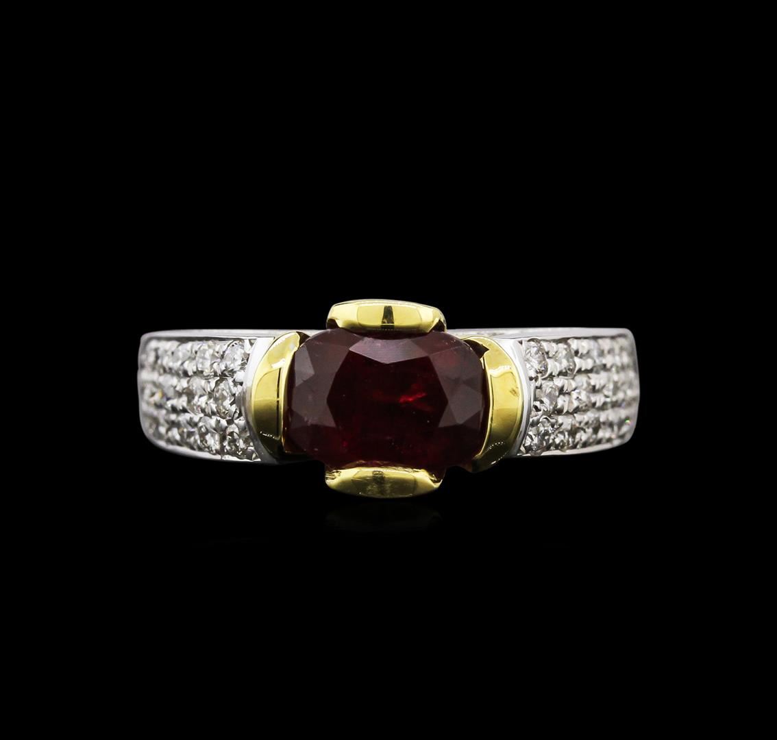 One electronically tested 18KT white and yellow gold lady's combination cast & assembled fashion ring with a bright polish finish. The featured lady's ring has a shank measuring 2.98 millimeters wide. Identified with markings of "18K". Condition is new, good workmanship. Containing: One prong set oval modified brilliant cut natural ruby, measuring 8.30 x 5.50 x 5.00mm, 5% bulge factor, approximate weight of 2.06ct., clarity is heavily included, type II, dark, very slightly brownish, orangy red color, (GIA oR 7/3), cut is good. Transmitting light somewhat diffusely, semi-transparent to translucent. Indications of laboratory high temperature heat treatment, with glass & flux additives. Graded in the setting. Thirty bead set round brilliant cut diamonds, measuring 1.60 - 1.55 x 1.03mm (depth est.) approximate total weight of 30 Stones = 0.48ct. Graded in the setting. Clarity: VS-2 to SI-2. Color: G - Good. Total Weight of Colored Stones 2.06ct. Total Weight of Diamonds 0.48ct. Total Weight of Ring 9.40gm. GAS Appraised at $4,325.00.