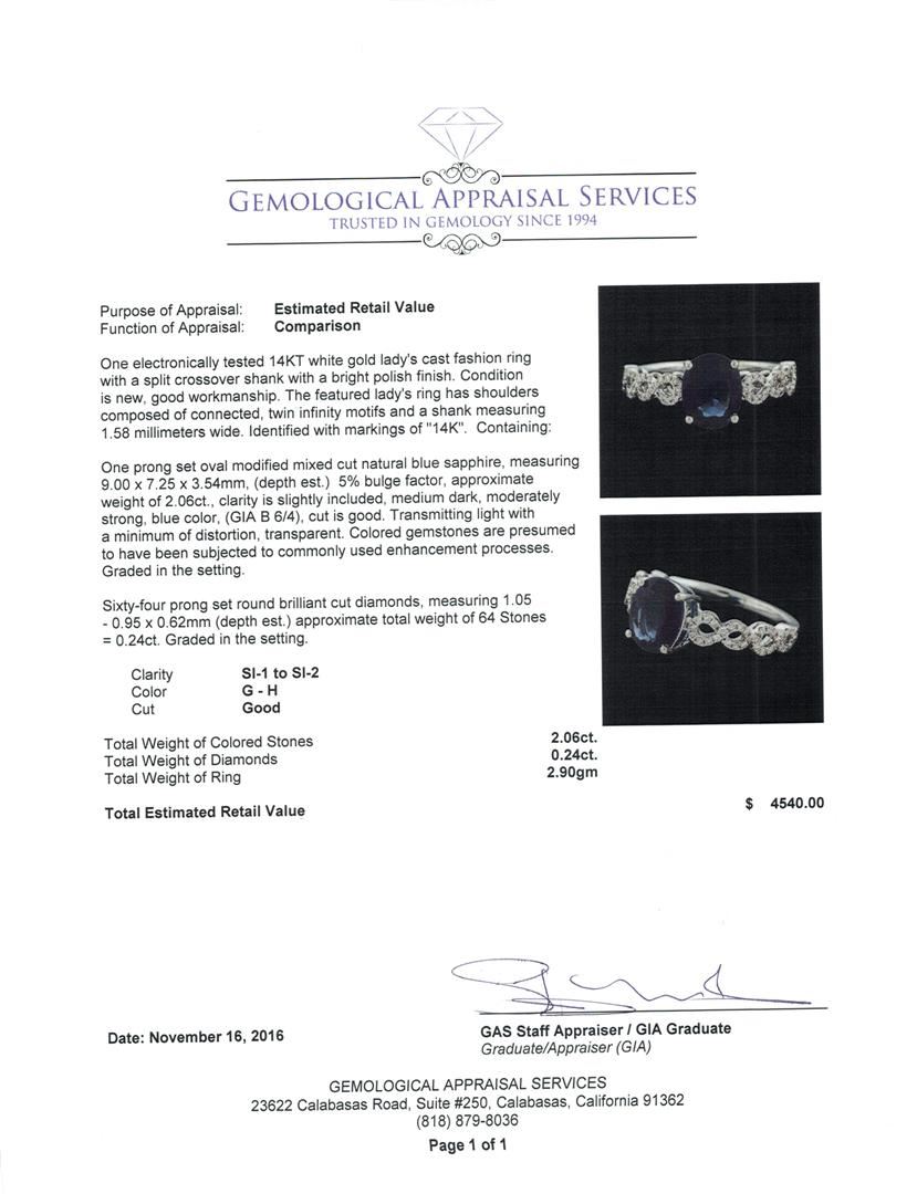 One electronically tested 14KT white gold lady's cast fashion ring with a split crossover shank with a bright polish finish. The featured lady's ring has shoulders composed of connected, twin infinity motifs and a shank measuring 1.58 millimeters wide. Identified with markings of '14K'. Condition is new, good workmanship. Containing: One prong set oval modified mixed cut natural blue sapphire, measuring 9.00 x 7.25 x 3.54mm, (depth est.) 5%. bulge factor, approximate weight of 2.06ct., clarity is slightly included, medium dark, moderately strong, blue color, (GIA B 6/4), cut is good. Transmitting light with a minimum of distortion, transparent. Colored gemstones are presumed to have been subjected to commonly used enhancement processes. Graded in the setting. Sixty-Four prong set round brilliant cut diamonds, measuring 1.05 - 0.95 x 0.62mm (depth est.) approximate total weight of 64 Stones = 0.24ct. Graded in the setting. Clarity SI-1 to SI-2. Color: G - H Cut Good. Total Weight of Colored Stones 2.06ct.. Total Weight of Diamonds 0.24ct.. Total Weight of Ring 2.90gm. GAS Appraised at $4,540.00.