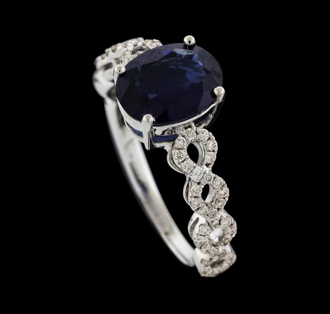 One electronically tested 14KT white gold lady's cast fashion ring with a split crossover shank with a bright polish finish. The featured lady's ring has shoulders composed of connected, twin infinity motifs and a shank measuring 1.58 millimeters wide. Identified with markings of '14K'. Condition is new, good workmanship. Containing: One prong set oval modified mixed cut natural blue sapphire, measuring 9.00 x 7.25 x 3.54mm, (depth est.) 5%. bulge factor, approximate weight of 2.06ct., clarity is slightly included, medium dark, moderately strong, blue color, (GIA B 6/4), cut is good. Transmitting light with a minimum of distortion, transparent. Colored gemstones are presumed to have been subjected to commonly used enhancement processes. Graded in the setting. Sixty-Four prong set round brilliant cut diamonds, measuring 1.05 - 0.95 x 0.62mm (depth est.) approximate total weight of 64 Stones = 0.24ct. Graded in the setting. Clarity SI-1 to SI-2. Color: G - H Cut Good. Total Weight of Colored Stones 2.06ct.. Total Weight of Diamonds 0.24ct.. Total Weight of Ring 2.90gm. GAS Appraised at $4,540.00.