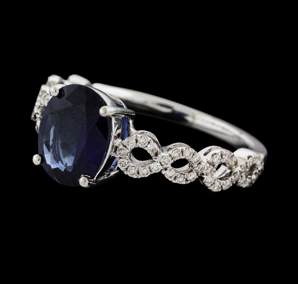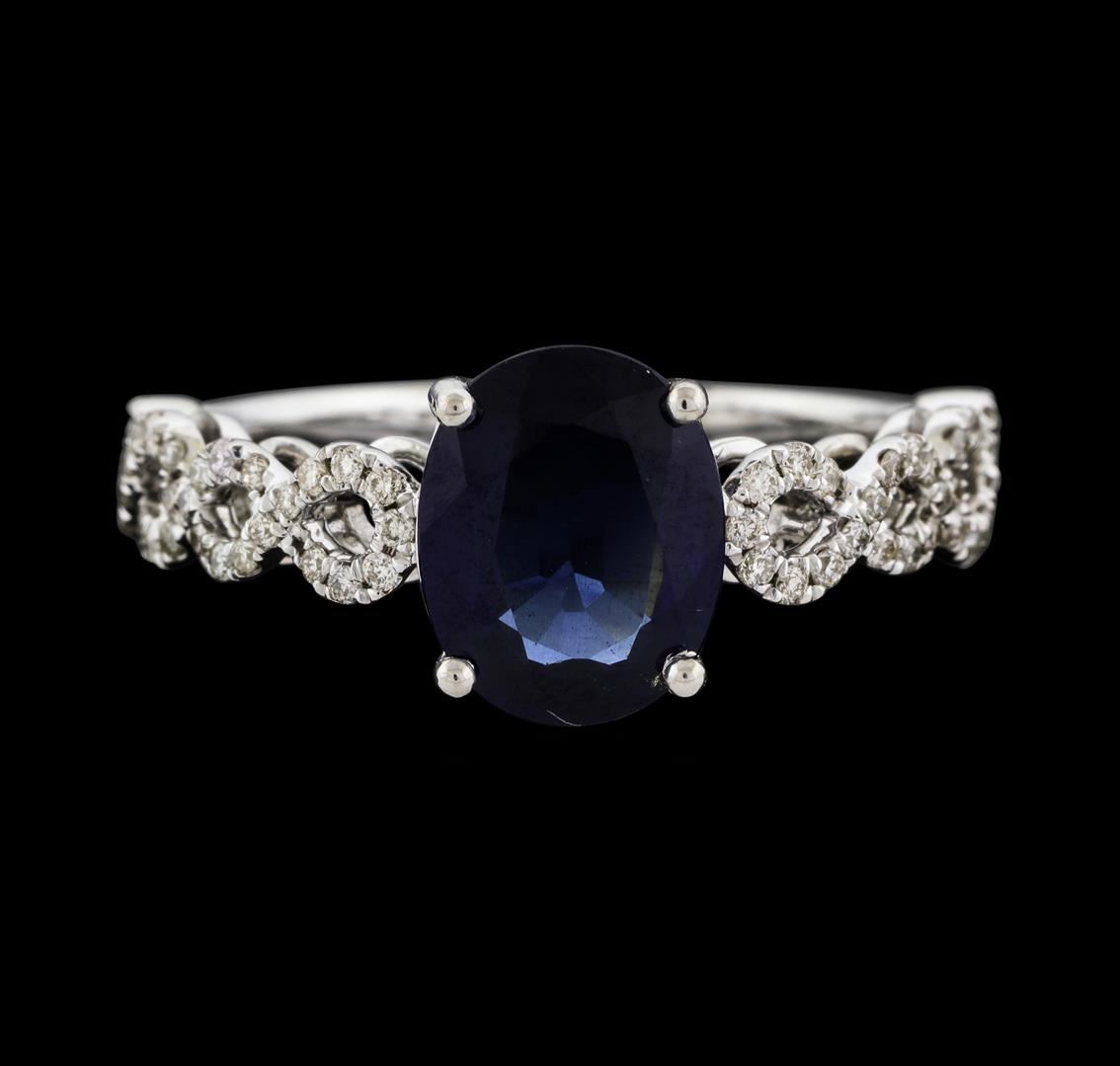 One electronically tested 14KT white gold lady's cast fashion ring with a split crossover shank with a bright polish finish. The featured lady's ring has shoulders composed of connected, twin infinity motifs and a shank measuring 1.58 millimeters wide. Identified with markings of '14K'. Condition is new, good workmanship. Containing: One prong set oval modified mixed cut natural blue sapphire, measuring 9.00 x 7.25 x 3.54mm, (depth est.) 5%. bulge factor, approximate weight of 2.06ct., clarity is slightly included, medium dark, moderately strong, blue color, (GIA B 6/4), cut is good. Transmitting light with a minimum of distortion, transparent. Colored gemstones are presumed to have been subjected to commonly used enhancement processes. Graded in the setting. Sixty-Four prong set round brilliant cut diamonds, measuring 1.05 - 0.95 x 0.62mm (depth est.) approximate total weight of 64 Stones = 0.24ct. Graded in the setting. Clarity SI-1 to SI-2. Color: G - H Cut Good. Total Weight of Colored Stones 2.06ct.. Total Weight of Diamonds 0.24ct.. Total Weight of Ring 2.90gm. GAS Appraised at $4,540.00.