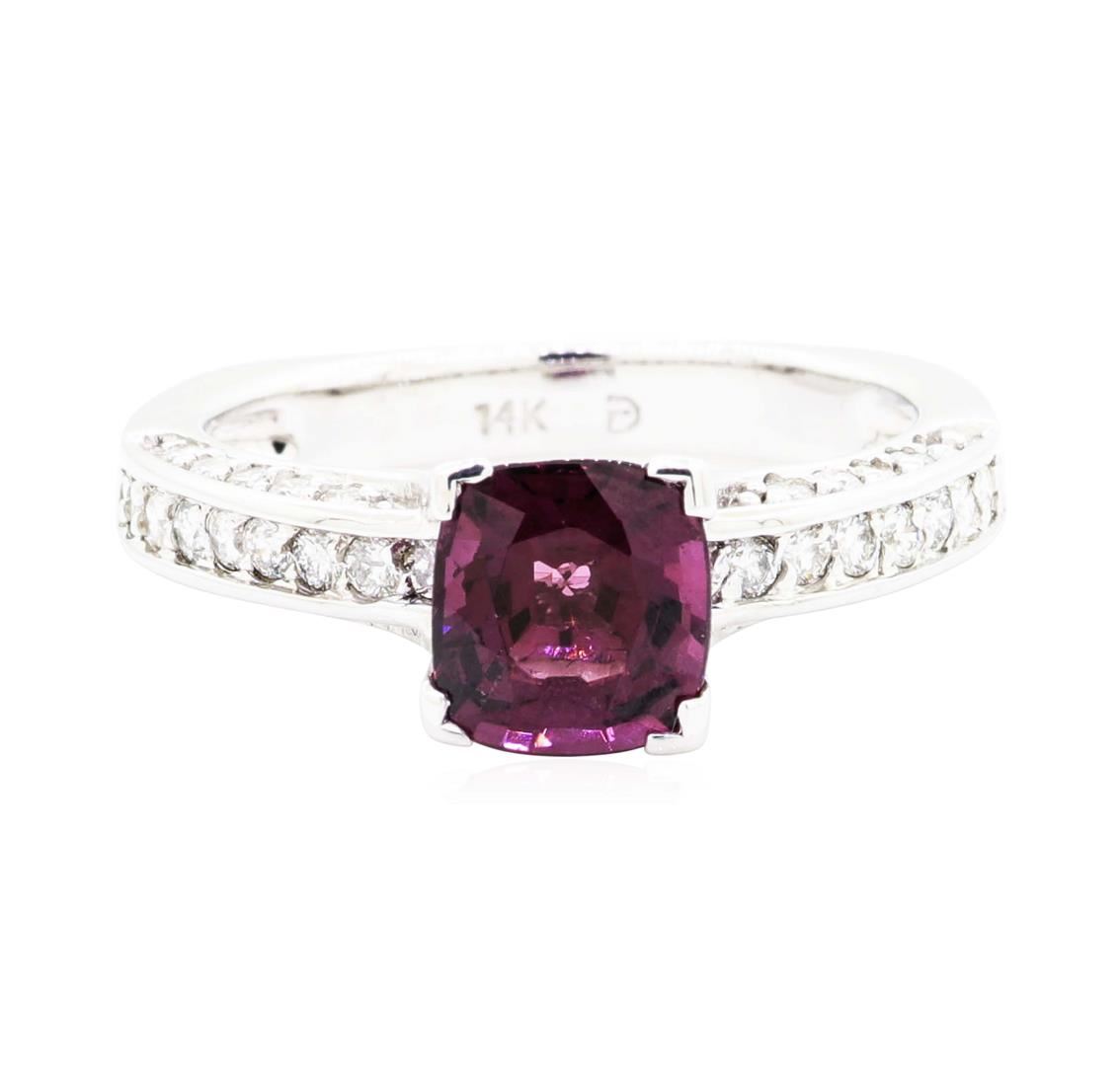 One electronically tested 14KT white gold lady's cast fashion ring with a European shank with a bright polish finish. The featured lady's ring has a shank measuring 2.87 millimeters wide. Identified with markings of '14K'. Condition is new, good workmanship. Containing: One prong set square cushion modified mixed cut natural lavender spinel, measuring 7.11 x 6.61 x 4.00mm, (depth est.) approximate weight of 1.52ct., clarity is eye clean, dark, moderately strong, reddish purple color, (GIA rP 7/4), cut is good. Transmitting light with no distortion, transparent. Colored gemstones are presumed to have been subjected to commonly used enhancement processes. Graded in the setting. Forty-Two prong set round brilliant cut diamonds, measuring 1.60 - 1.40 x 0.90mm (depth est.) approximate total weight of 42 Stones = 0.54ct. Graded in the setting. Color G - I Clarity SI-1 to SI-2 Cut Good. Total Weight of Colored Stones 1.52ct.. Total Weight of Diamonds 0.54ct.. Total Weight of Ring 4.40gm GAS Appraised at  $3435.00. GAS Appraised.