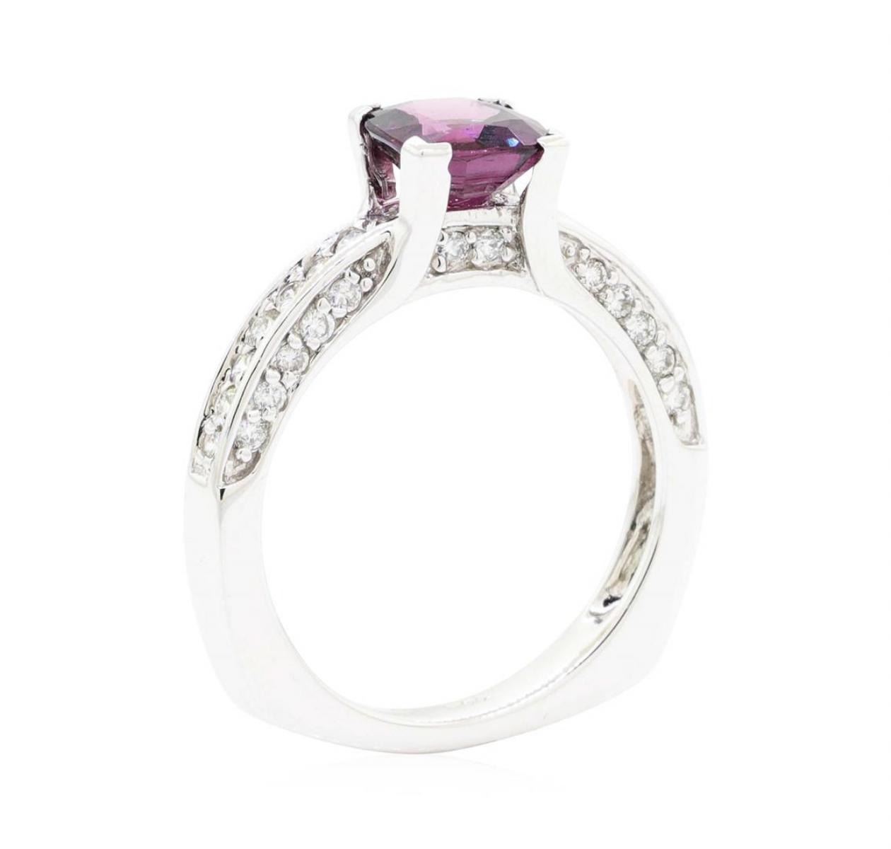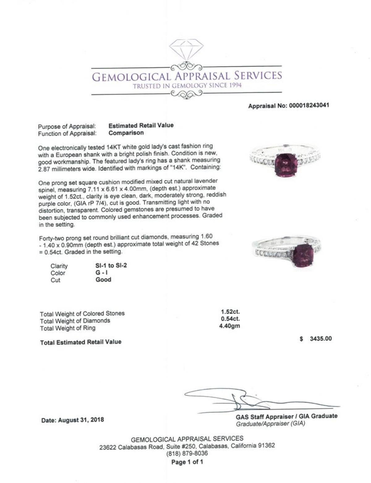 One electronically tested 14KT white gold lady's cast fashion ring with a European shank with a bright polish finish. The featured lady's ring has a shank measuring 2.87 millimeters wide. Identified with markings of '14K'. Condition is new, good workmanship. Containing: One prong set square cushion modified mixed cut natural lavender spinel, measuring 7.11 x 6.61 x 4.00mm, (depth est.) approximate weight of 1.52ct., clarity is eye clean, dark, moderately strong, reddish purple color, (GIA rP 7/4), cut is good. Transmitting light with no distortion, transparent. Colored gemstones are presumed to have been subjected to commonly used enhancement processes. Graded in the setting. Forty-Two prong set round brilliant cut diamonds, measuring 1.60 - 1.40 x 0.90mm (depth est.) approximate total weight of 42 Stones = 0.54ct. Graded in the setting. Color G - I Clarity SI-1 to SI-2 Cut Good. Total Weight of Colored Stones 1.52ct.. Total Weight of Diamonds 0.54ct.. Total Weight of Ring 4.40gm GAS Appraised at $3435.00. GAS Appraised.