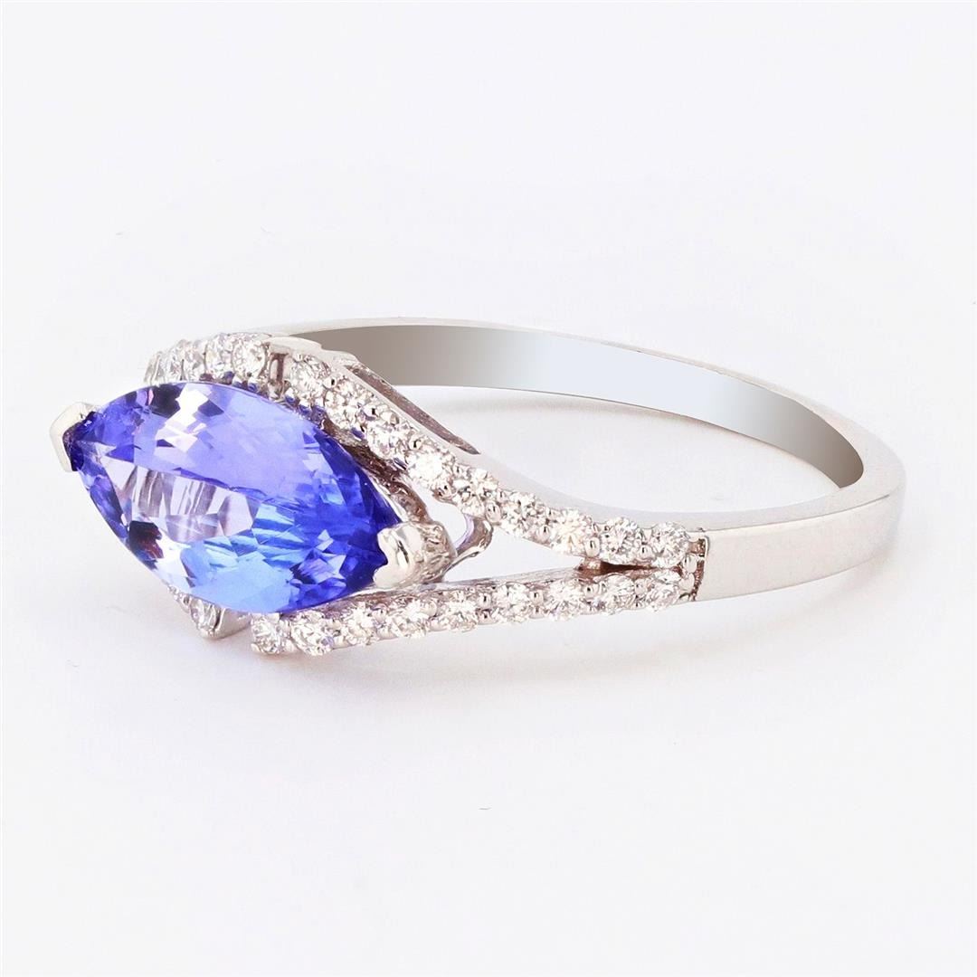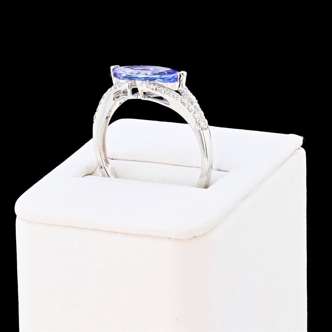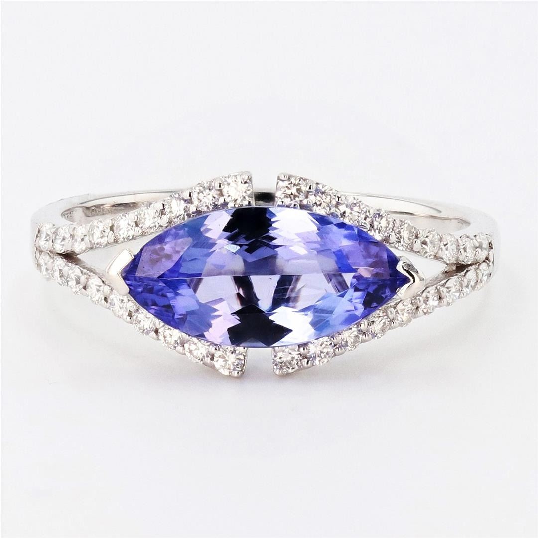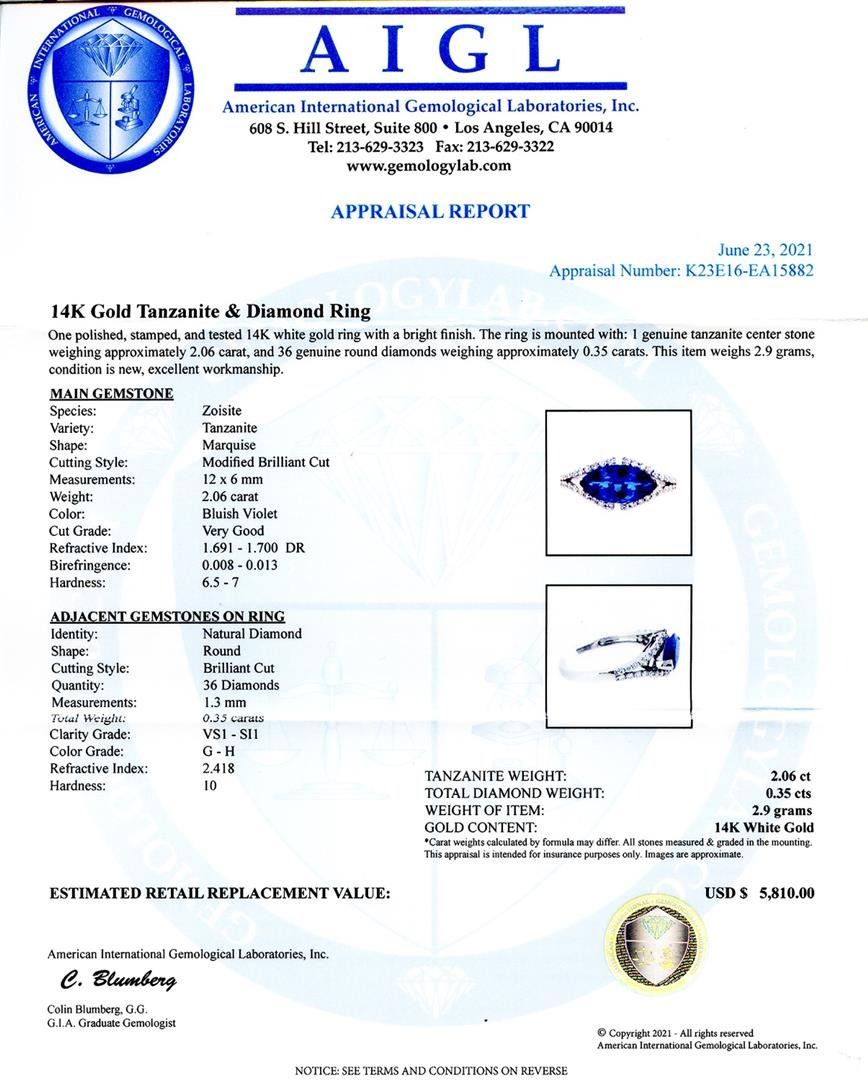 2.06ct Tanzanite and 0.35ctw Diamond 14K White Gold Ring. One polished, stamped, and tested 14K white gold ring with a bright finish. The ring is mounted with: 1 genuine tanzanite center stone weighing approximately 2.06 carat, and 36 genuine round diamonds weighing approximately 0.35 carats. This item weighs 2.9 grams, condition is new, excellent workmanship. MAIN GEMSTONE Species: Zoisite Variety: Tanzanite Shape: Marquise Cutting Style: Modified Brilliant Cut Measurements: 12 x 6mm Weight: 2.06 carat Color: Bluish Violet Cut Grade: Very Good Refractive Index: 1.691 - 1.700 DR Birefringence: 0.008 - 0.013 Hardness: 6.5 - 7 ADJACENT GEMSTONES ON RING Identity: Natural Diamond Shape: Round Cutting Style: Brilliant Cut Quantity: 36 Diamonds Measurements: 1.3mm Total Weight: 0.35 carats Clarity Grade: VS1 to SI1 Color Grade: G - H Refractive Index: 2.418 Hardness: 10 TANZANITE WEIGHT: 2.06ct TOTAL DIAMOND WEIGHT: 0.35ctw WEIGHT OF ITEM: 2.9 grams GOLD CONTENT: 14K White Gold