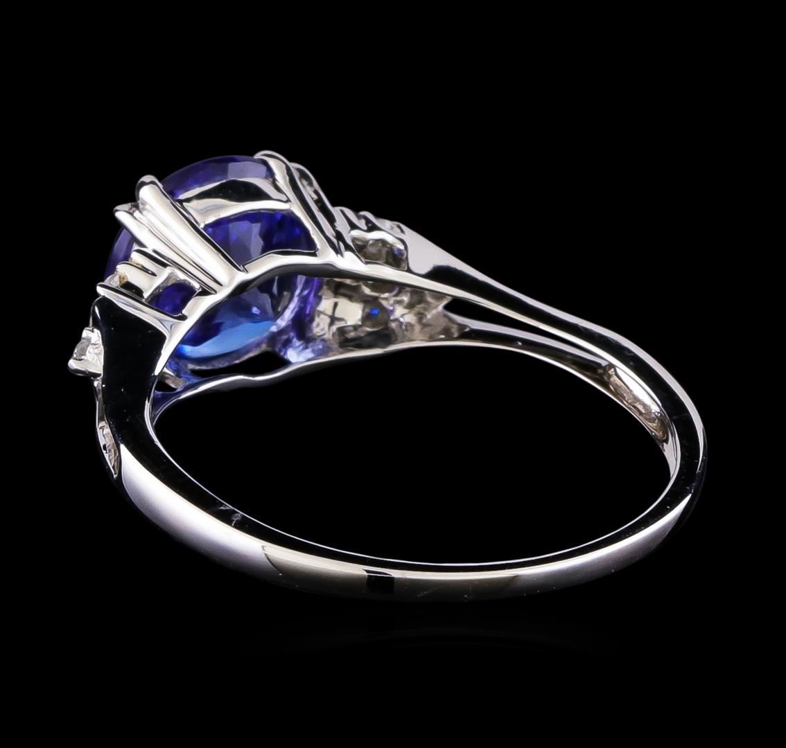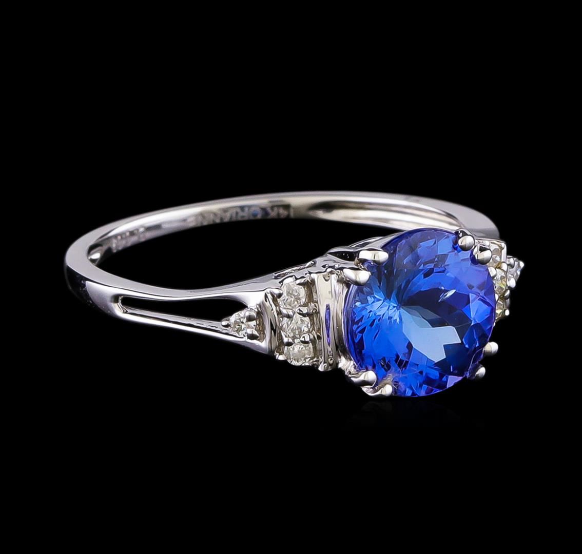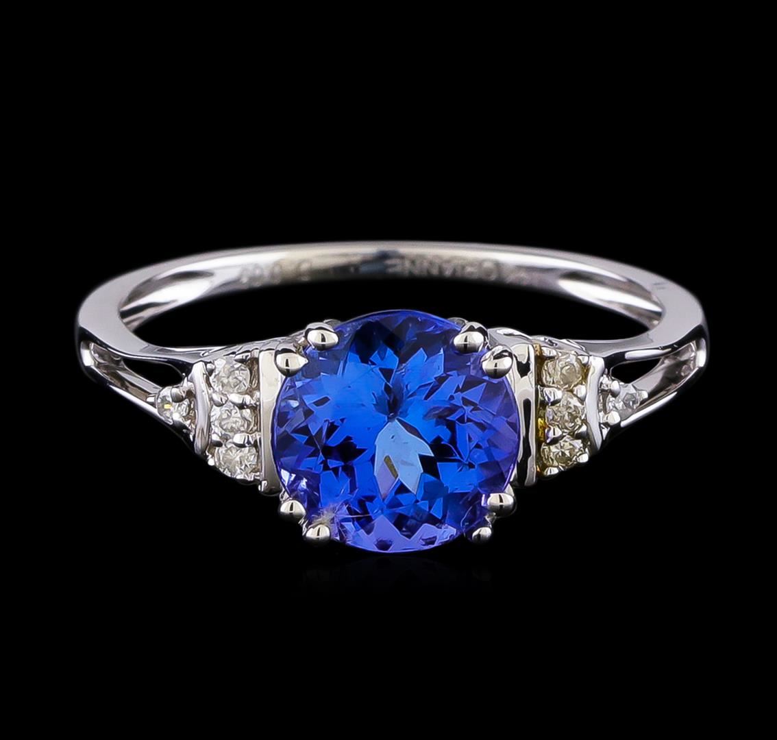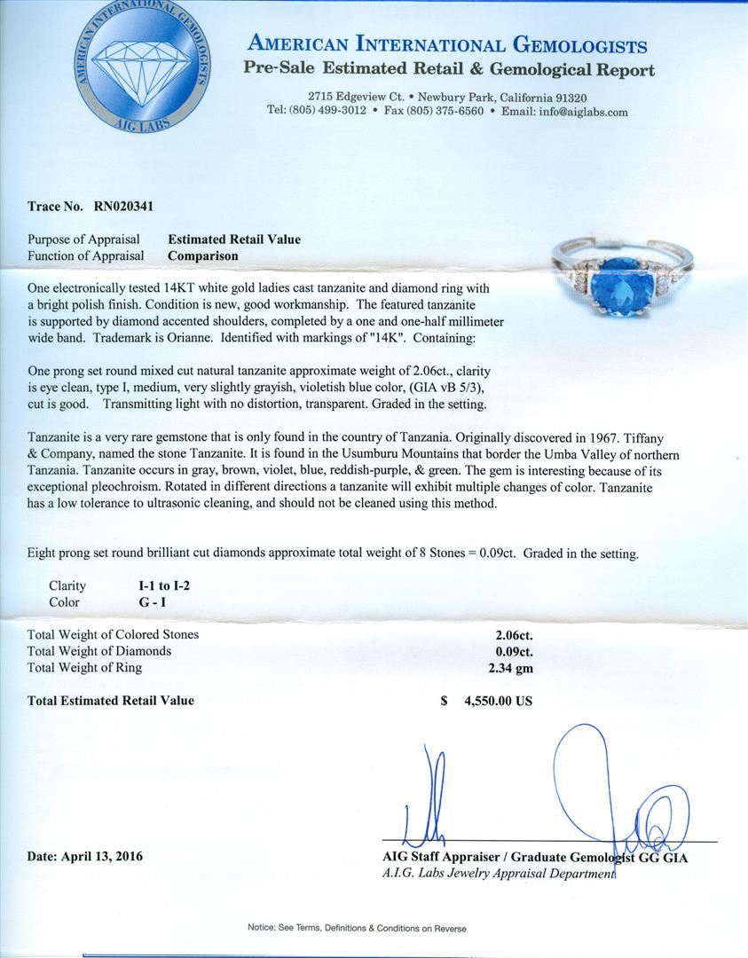 One electronically tested 14KT white gold ladies cast tanzanite and diamond ring with a bright polish finish. The featured tanzanite is supported by diamond accented shoulders, completed by a one and one-half millimeter wide band. Trademark is Orianne. Identified with markings of "14K". Condition is new, good workmanship. Containing: One prong set round mixed cut natural tanzanite approximate weight of 2.06ct., clarity is eye clean, type I, medium, very slightly grayish, violetish blue color, (GIA vB 5/3), cut is good. Transmitting light with no distortion, transparent. Graded in the setting. Tanzanite is a very rare gemstone that is only found in the country of Tanzania. Originally discovered in 1967. Tiffany & Company, named the stone Tanzanite. It is found in the Usumburu Mountains that border the Umba Valley of northern Tanzania. Tanzanite occurs in gray, brown, violet, blue, reddish-purple, & green. The gem is interesting because of its exceptional pleochroism. Rotated in different directions a tanzanite will exhibit multiple changes of color. Tanzanite has a low tolerance to ultrasonic cleaning, and should not be cleaned using this method. Eight prong set round brilliant cut diamonds approximate total weight of 8 Stones = 0.09ct. Graded in the setting. Clarity: I-1 to I-2. Color: G - I. Total Weight of Colored Stones 2.06ct. Total Weight of Diamonds 0.09ct. Total Weight of Ring 2.34gm. AIG Appraised at $4,550.00.