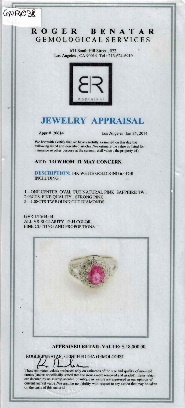 14K WHITE GOLD NATURAL CEYLON PINK SAPPHIRE RING:6.01 GRAMS/DIAMOND:1.08CT/PINK SAPPHIRE:2.06CT/#GVR1038 **Pink Sapphire stimulates the gentle emotions of love, forgiveness, acceptance and release. Like the flush of a young lover's cheeks, this sensational 2.06ct oval cut natural Pink Sapphire is a delight to behold. Artfully crafted in 14k white gold, this ring is an investment piece. Sparkling 1.08ct round cut diamonds cascade in a wreath surrounding this precious gem, drawing the eye to its brilliant hue.**