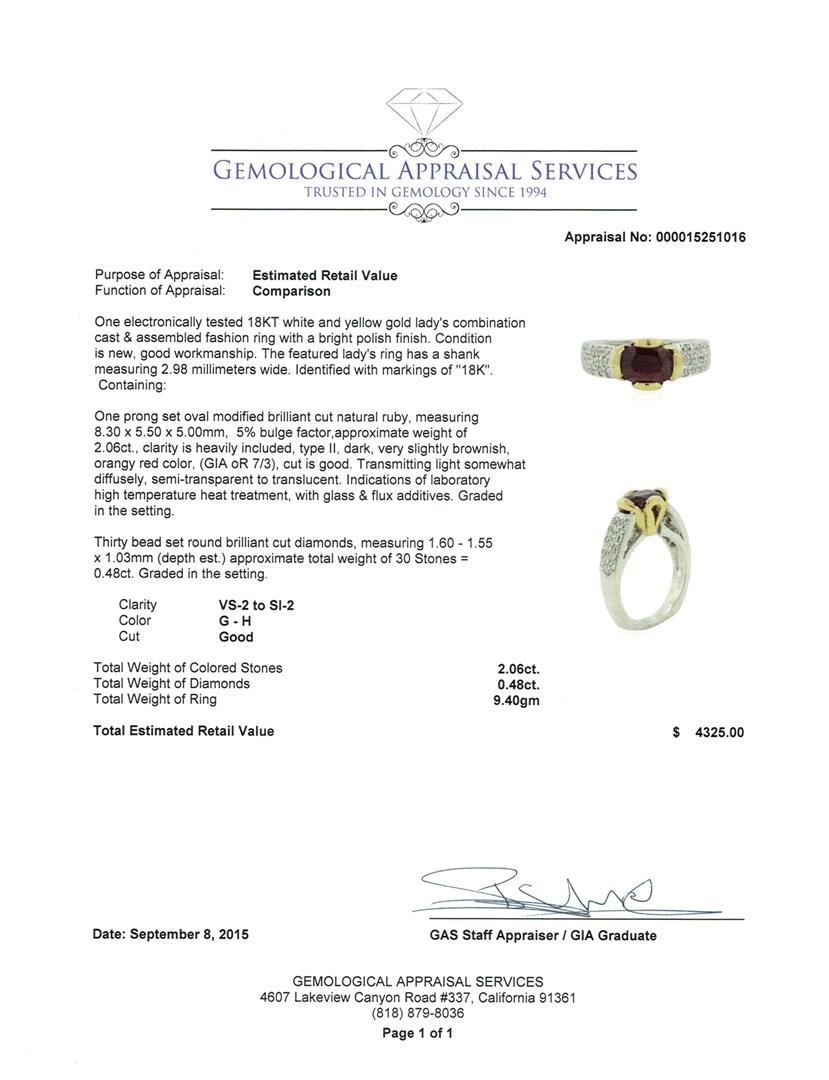 One electronically tested 18KT white and yellow gold lady's combination cast & assembled fashion ring with a bright polish finish. The featured lady's ring has a shank measuring 2.98 millimeters wide. Identified with markings of "18K". Condition is new, good workmanship. Containing: One prong set oval modified brilliant cut natural ruby, measuring 8.30 x 5.50 x 5.00mm, 5% bulge factor, approximate weight of 2.06ct., clarity is heavily included, type II, dark, very slightly brownish, orangy red color, (GIA oR 7/3), cut is good. Transmitting light somewhat diffusely, semi-transparent to translucent. Indications of laboratory high temperature heat treatment, with glass & flux additives. Graded in the setting. Thirty bead set round brilliant cut diamonds, measuring 1.60 - 1.55 x 1.03mm (depth est.) approximate total weight of 30 Stones = 0.48ct. Graded in the setting. Clarity: VS-2 to SI-2. Color: G - Good. Total Weight of Colored Stones 2.06ct. Total Weight of Diamonds 0.48ct. Total Weight of Ring 9.40gm. GAS Appraised at $4,325.00.