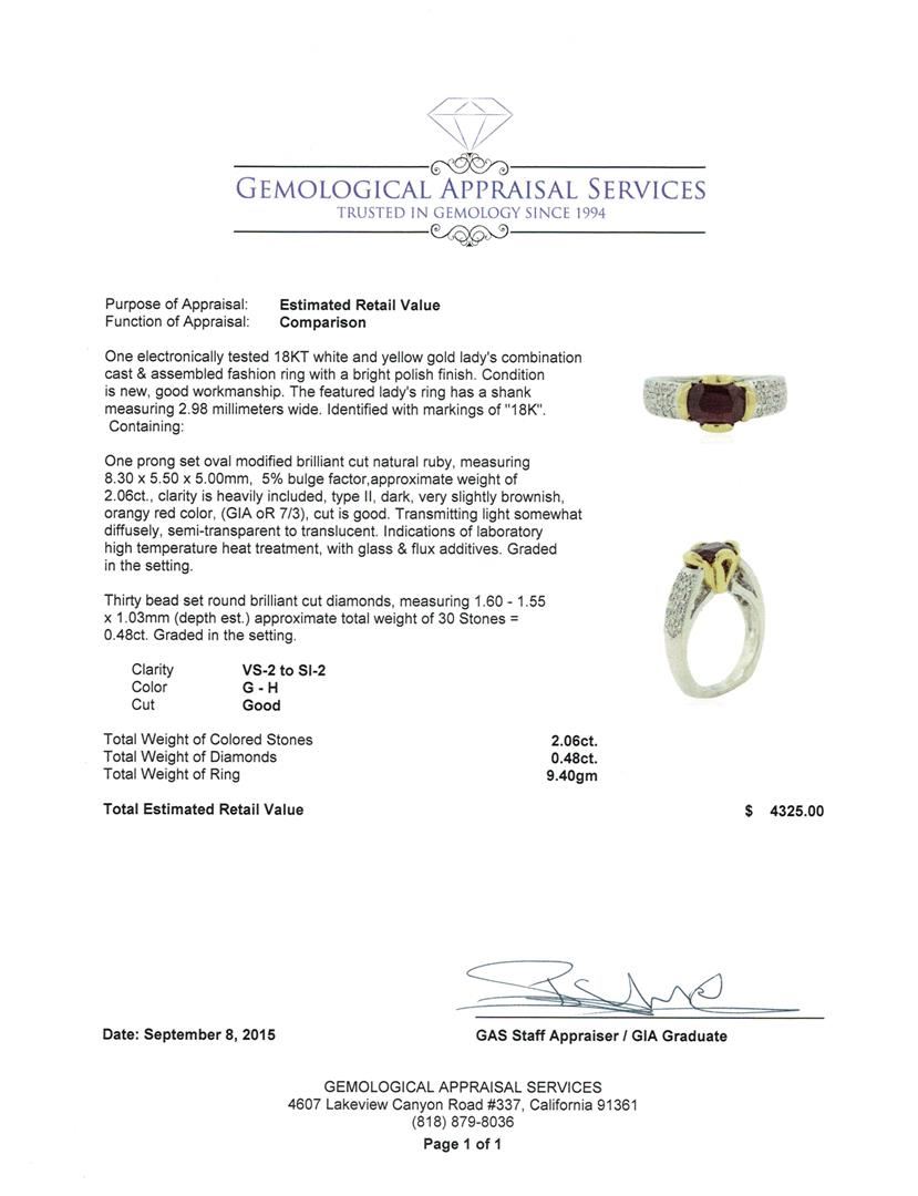 One electronically tested 18KT white and yellow gold lady's combination cast & assembled fashion ring with a bright polish finish. The featured lady's ring has a shank measuring 2.98 millimeters wide. Identified with markings of "18K". Condition is new, good workmanship. Containing: One prong set oval modified brilliant cut natural ruby, measuring 8.30 x 5.50 x 5.00mm, 5% bulge factor, approximate weight of 2.06ct., clarity is heavily included, type II, dark, very slightly brownish, orangy red color, (GIA oR 7/3), cut is good. Transmitting light somewhat diffusely, semi-transparent to translucent. Indications of laboratory high temperature heat treatment, with glass & flux additives. Graded in the setting. Thirty bead set round brilliant cut diamonds, measuring 1.60 - 1.55 x 1.03mm (depth est.) approximate total weight of 30 Stones = 0.48ct. Graded in the setting. Clarity: VS-2 to SI-2. Color: G - Good. Total Weight of Colored Stones 2.06ct. Total Weight of Diamonds 0.48ct. Total Weight of Ring 9.40gm. GAS Appraised at $4,325.00.
