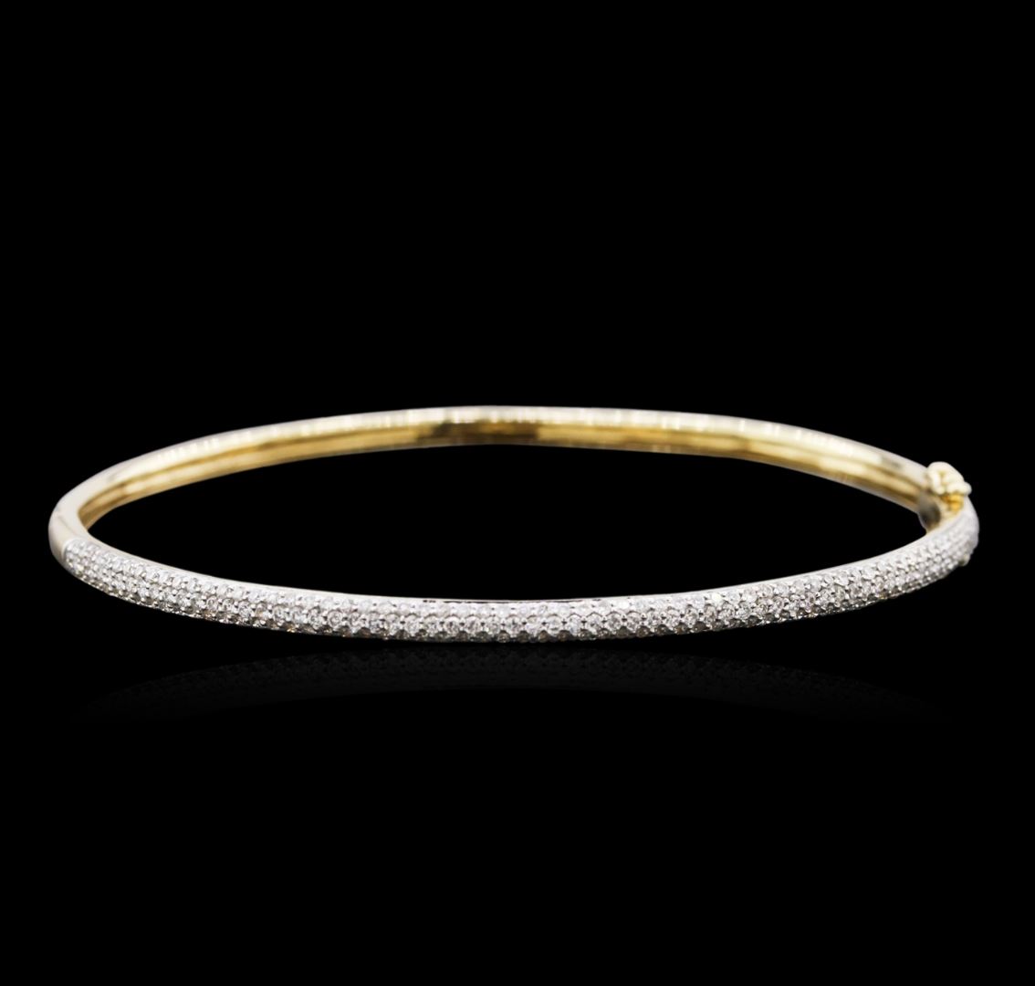 One electronically tested 14KT yellow gold ladies cast diamond bangle bracelet with a hidden box clasp with safety closer with a bright polish finish. Identified with markings of "14K". Condition is new. Containing: Two Hundred Fifty-Seven prong set round brilliant cut diamonds, measuring 1.30 - 1.30 x 0.78mm (depth est.) approximate total weight of 257 Stones = 2.06ct. Clarity: SI-2 to I-2. Color: I - J, Cut is Good. Diamonds are graded in the mounting, unless otherwise stated. Total Weight of Diamonds 2.06ct. Total Weight of Bangle Bracelet 69.00 grams. GGL Appraised at $5,700.00.