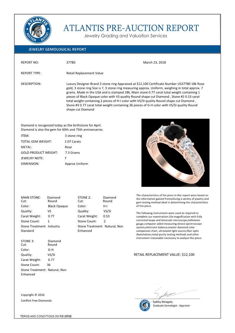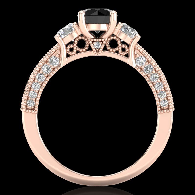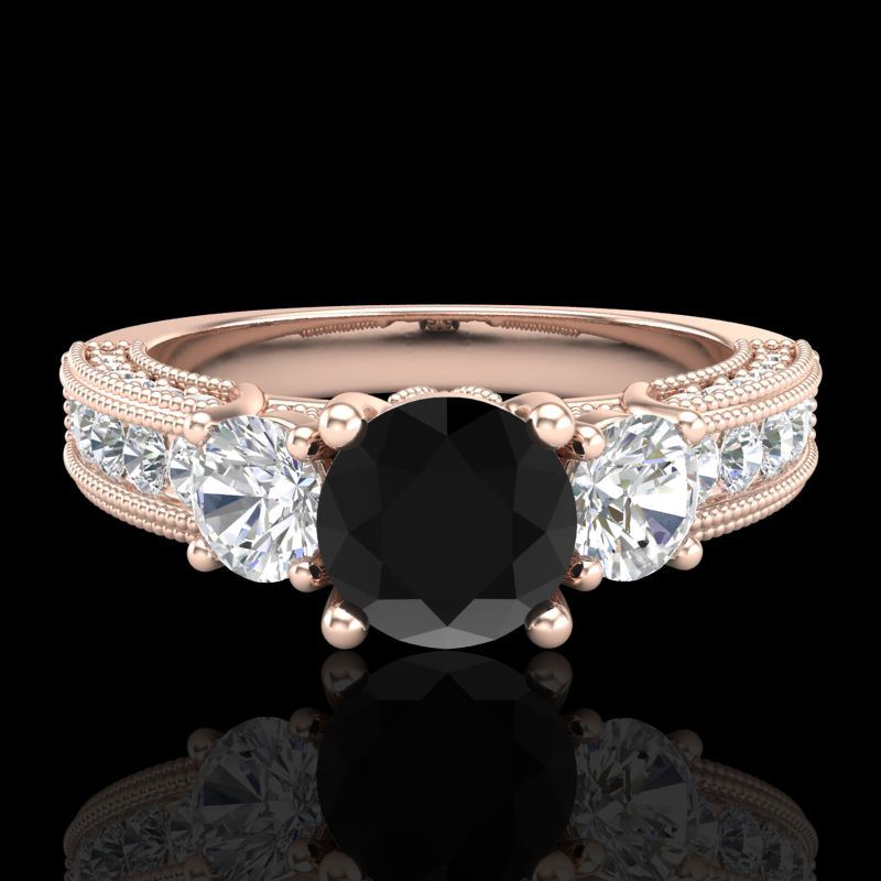 REF-200A2X -37780 ---- 2.07 CTW Fancy Black Diamond Solitaire Art Deco 3 Stone Ring 18K Rose Gold ---- Luxury Designer Brand 3 stone ring Appraised at $12,100 Certificate Number US37780 18k Rose gold, 3 stone ring Size is 7, 3 stone ring measuring approx. Uniform, weighing in total approx. 7 grams. Made in the USA and is stamped 18k, Main stone 0.77 carat total weight containing 1 pieces of Black Opaque color with VS quality Round shape cut Diamond , Stone #2 0.53 carat total weight containing 2 pieces of H-I color with VS/SI quality Round shape cut Diamond , Stone #3 0.77 carat total weight containing 36 pieces of G-H color with VS/SI quality Round shape cut Diamond