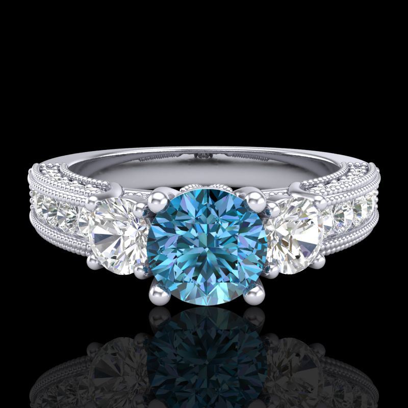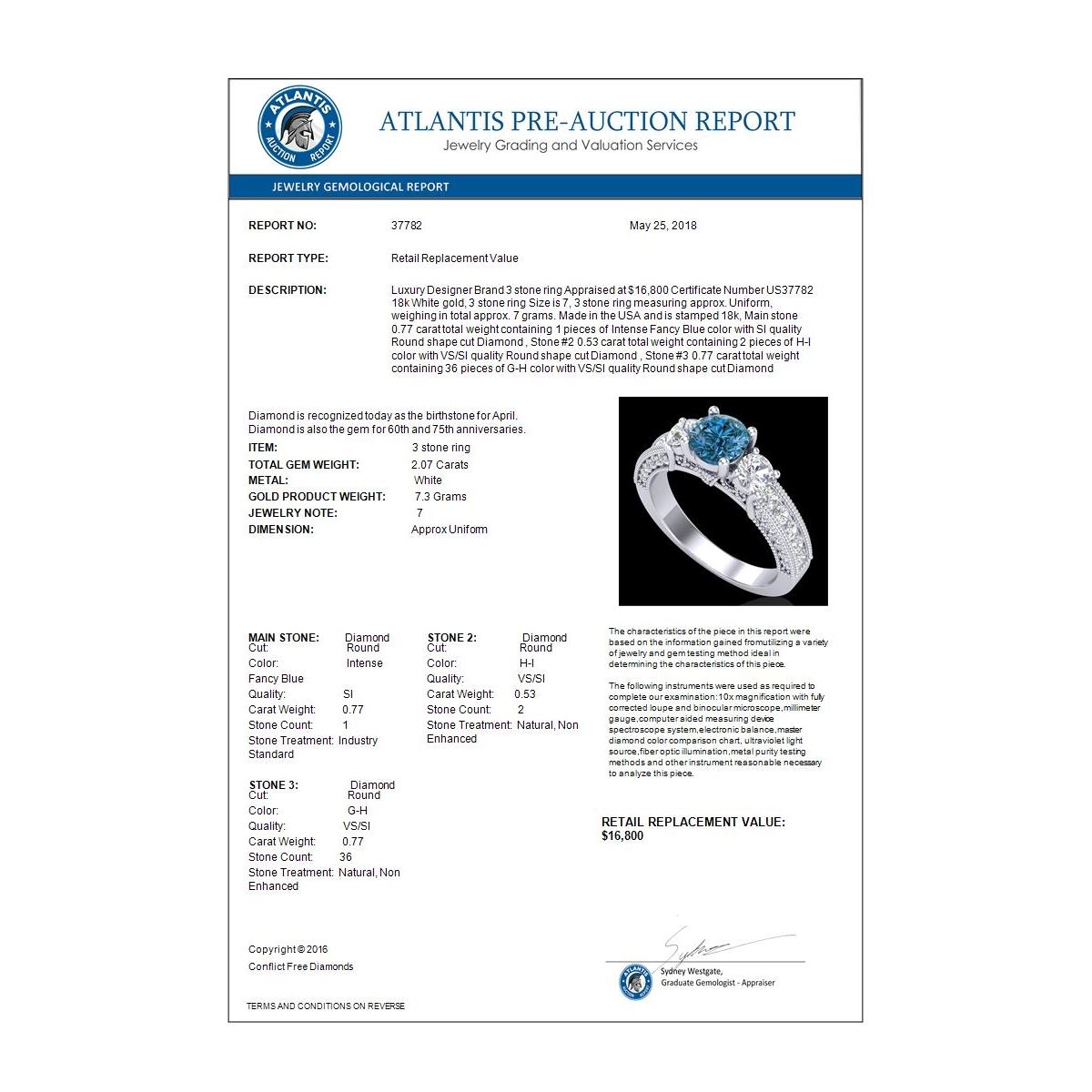 REF-254W5F -37782 ---- 2.07 CTW Intense Blue Diamond Solitaire Art Deco 3 Stone Ring 18K White Gold ---- Luxury Designer Brand 3 stone ring Appraised at $16,800 Certificate Number US37782 18k White gold, 3 stone ring Size is 7, 3 stone ring measuring approx. Uniform, weighing in total approx. 7 grams. Made in the USA and is stamped 18k, Main stone 0.77 carat total weight containing 1 pieces of Intense Fancy Blue color with SI quality Round shape cut Diamond , Stone #2 0.53 carat total weight containing 2 pieces of H-I color with VS/SI quality Round shape cut Diamond , Stone #3 0.77 carat total weight containing 36 pieces of G-H color with VS/SI quality Round shape cut Diamond