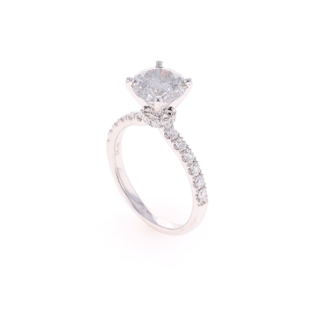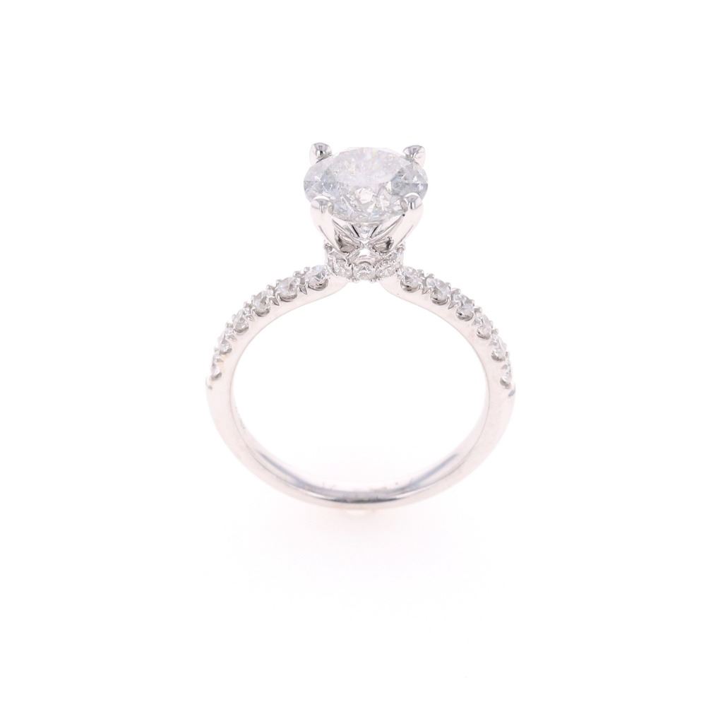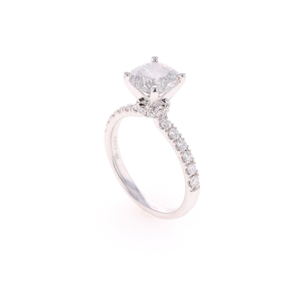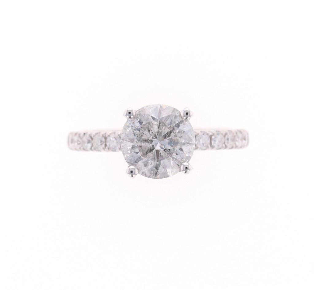 This is an exquiste solataire diamond ring set in 18K white gold showing a center diamond with 2.07 carat weight, accompanied by AIGL paperwork. The ring is stamped 18K showing an 18 karat white gold setting with diamonds set down each shoulder, having a raised four prong solitaire setting with diamond set halo ring around the base holding the center 2.07 carat round brilliant natural diamond. The center stone has a color of H and I1 clarity. The ring is also set with 22 other round brilliant natural diamonds totaling 0.45 carats with F color and VS2 to SI2 clarity. Ring is a size of 6 US with 3.8 gram weight and total diamond carat weight of 2.52. The piece comes with AIGL (American International Gemological Laboratories, INC., a GIA graduate gemologists # K12D995-EA17525) gemology report and appraisal which confirms the above and gives a value of $27,641.00.