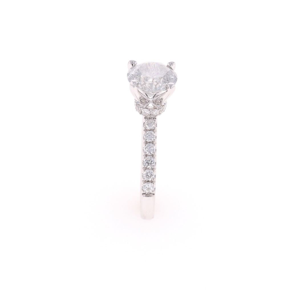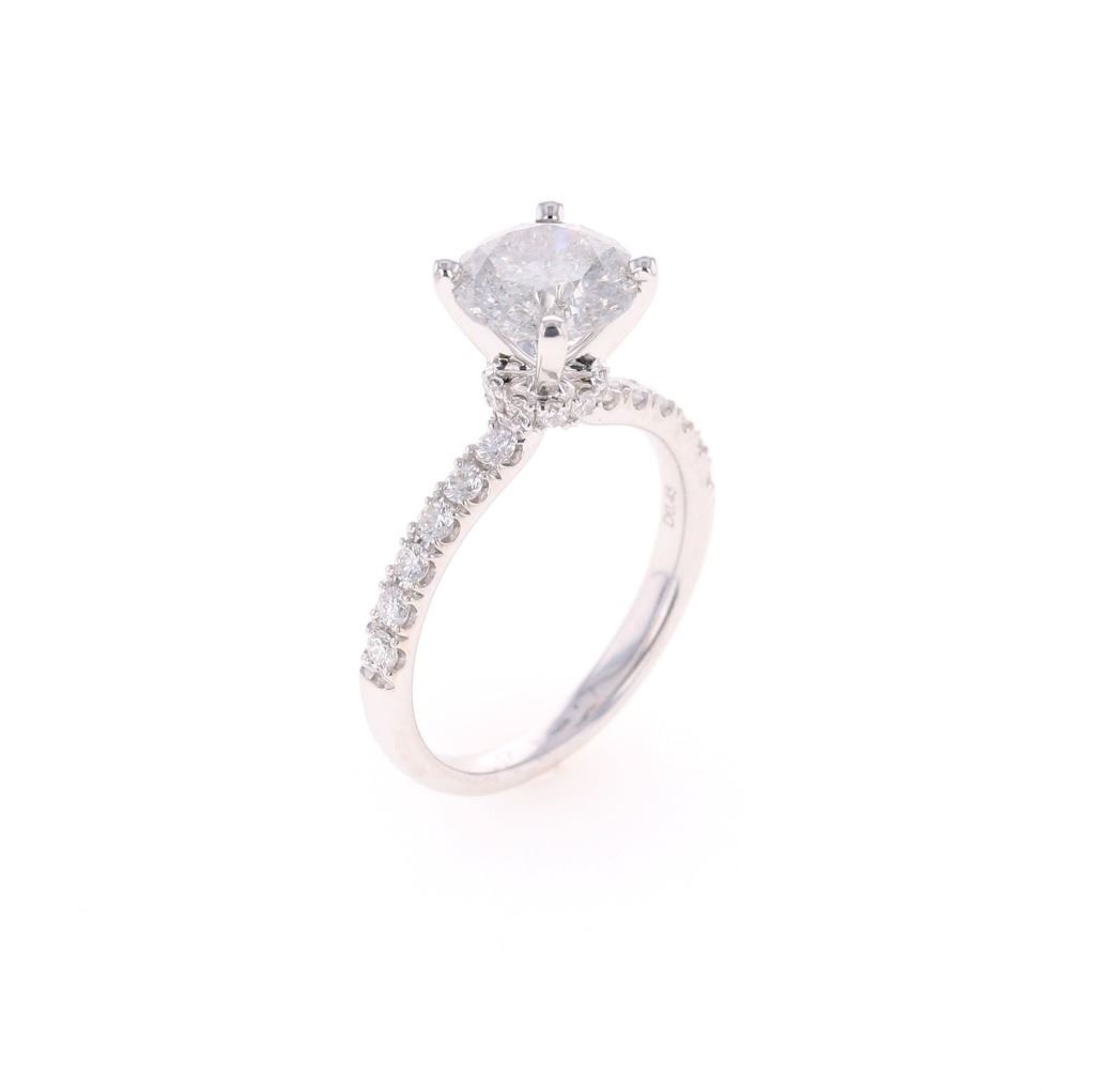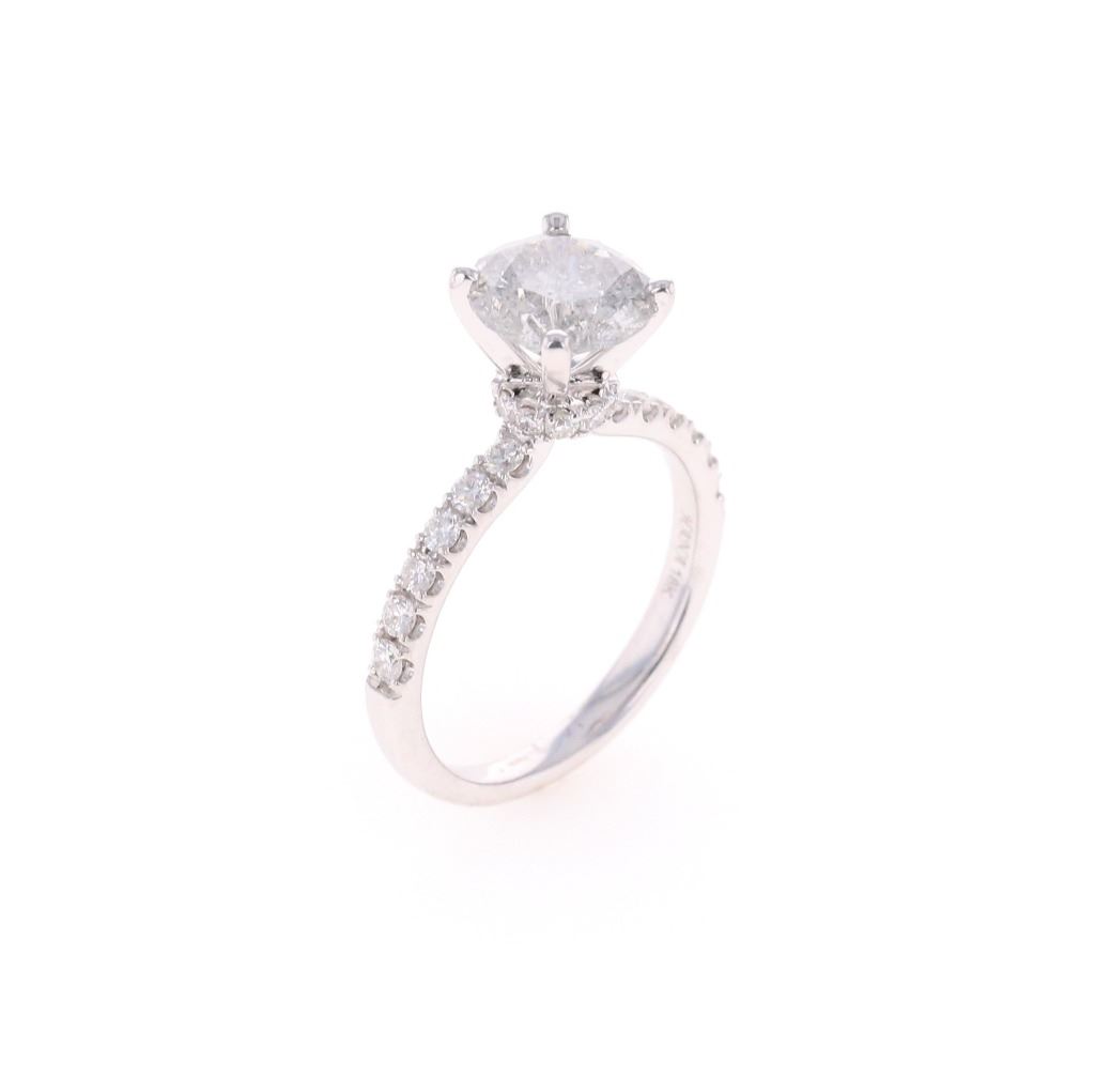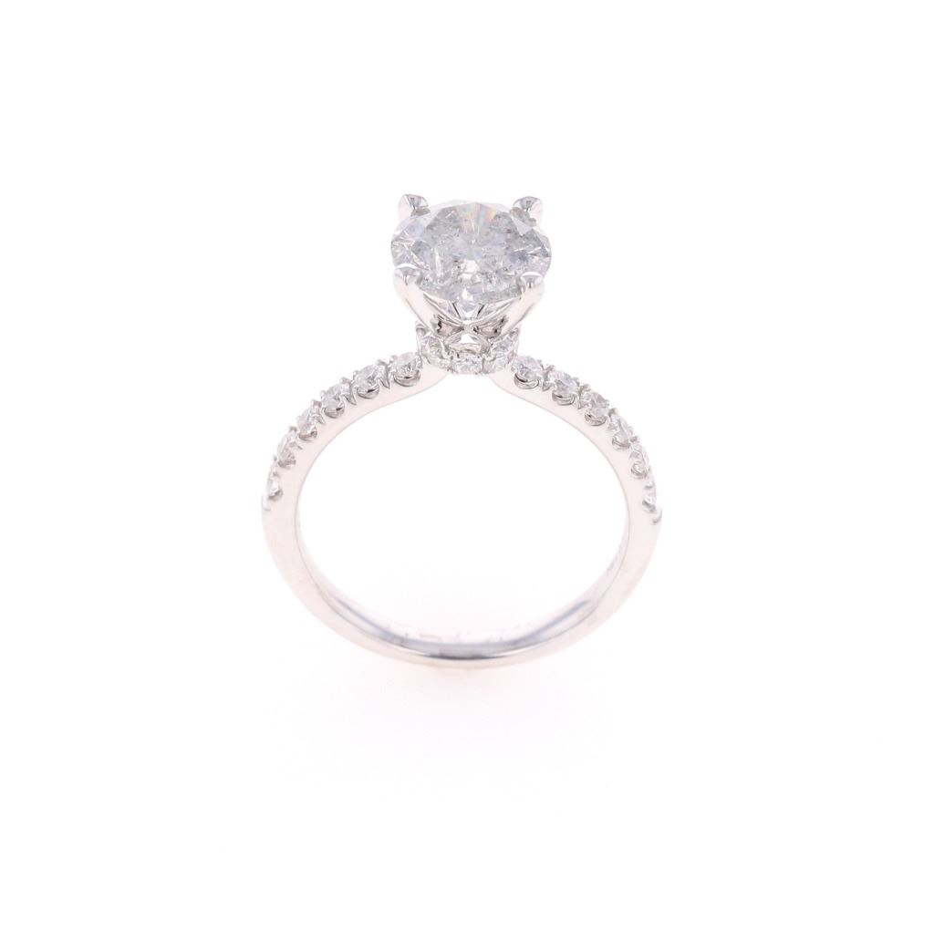 This is an exquiste solataire diamond ring set in 18K white gold showing a center diamond with 2.07 carat weight, accompanied by AIGL paperwork. The ring is stamped 18K showing an 18 karat white gold setting with diamonds set down each shoulder, having a raised four prong solitaire setting with diamond set halo ring around the base holding the center 2.07 carat round brilliant natural diamond. The center stone has a color of H and I1 clarity. The ring is also set with 22 other round brilliant natural diamonds totaling 0.45 carats with F color and VS2 to SI2 clarity. Ring is a size of 6 US with 3.8 gram weight and total diamond carat weight of 2.52. The piece comes with AIGL (American International Gemological Laboratories, INC., a GIA graduate gemologists # K12D995-EA17525) gemology report and appraisal which confirms the above and gives a value of $27,641.00.