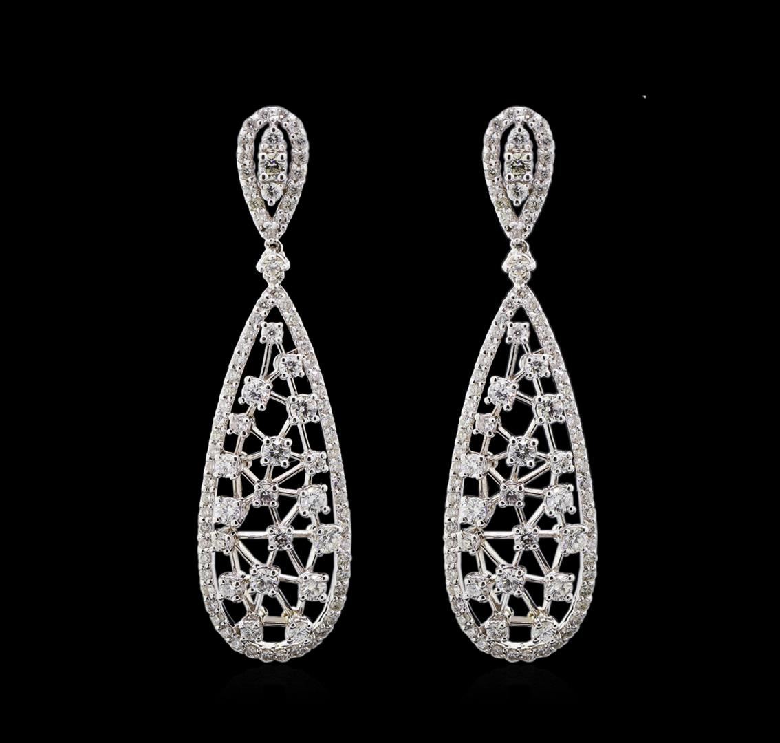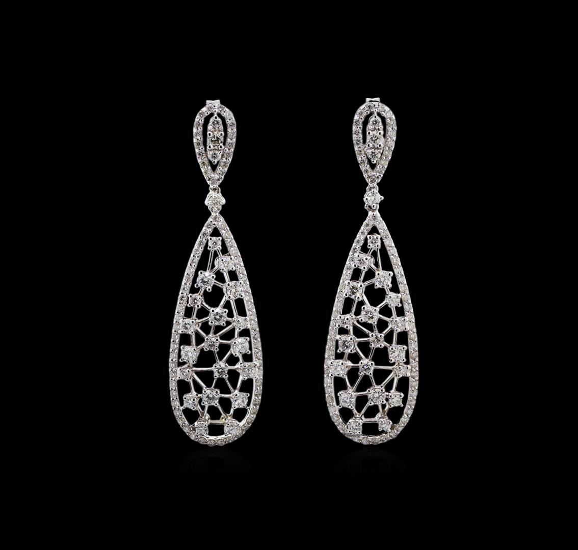 One pair electronically tested 14KT white gold lady's combination cast & assembled fashion dangle earrings with medium friction backs with a bright polish finish. The featured lady's dangle earrings have a 46 millimeter drop in length. Identified with markings of "585". Condition is new, good workmanship. Containing: Thirty-Two prong set round brilliant cut diamonds, measuring 2.20 - 1.80 x 1.23mm (depth est.) approximate total weight of 32 Stones = 0.99ct. Graded in the setting. Clarity: SI-1 to SI-2. Color: H - I. Cut Good Fourteen prong set round brilliant cut diamonds, measuring 1.60 - 1.50 x 0.96mm (depth est.) approximate total weight of 14 Stones = 0.20ct. Graded in the setting. Clarity: SI-1 to SI-2. Color: H - I. Cut Good One Hundred Forty prong set round brilliant cut diamonds, measuring 1.20 - 1.10 x 0.71mm (depth est.) approximate total weight of 140 Stones = 0.88ct. Graded in the setting. Clarity: SI-1 to I-1. Color: G - I. Cut Good. Total Weight of Diamonds 2.07ct. Total Weight of Dangle Earrings 8.50gm. GAS Appraised at $7,305.00.