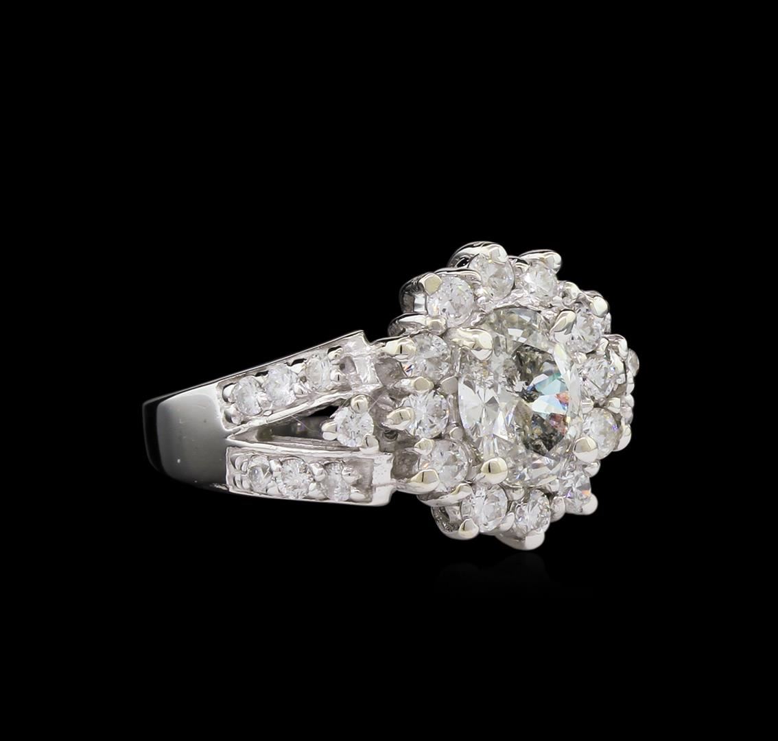 One electronically tested 14KT white gold lady's cast wedding ring with a basket halo with a bright polish finish. The featured lady's ring has a shank measuring 1.79 millimeters wide. Condition is new, good workmanship. Containing: One prong set oval shaped cut diamond, measuring 7.90 x 6.15 x 3.61mm (depth est.) , 5.00.%. GTCF approximate weight of 1.22ct. Graded in the setting. Clarity: I-1. Color: J - Good Twelve prong set round brilliant cut diamonds, measuring 2.30 - 2.25 x 1.44mm (depth est.) approximate total weight of 12 Stones = 0.55ct. Graded in the setting. Clarity: SI-1 to I-1. Color: H - I. Cut Good Fourteen prong set round brilliant cut diamonds, measuring 1.80 - 1.75 x 1.10mm (depth est.) approximate total weight of 14 Stones = 0.30ct. Graded in the setting. Clarity: SI-1 to I-1. Color: H - I. Cut Good. Total Weight of Diamonds 2.07ct. Total Weight of Ring 5.90gm. GAS Appraised at $8,905.00.