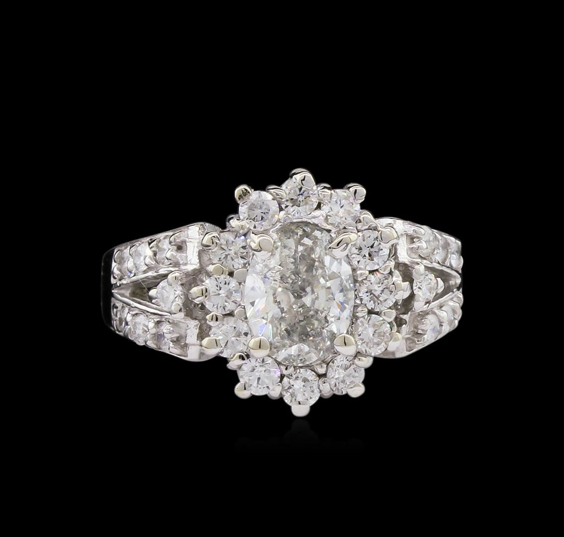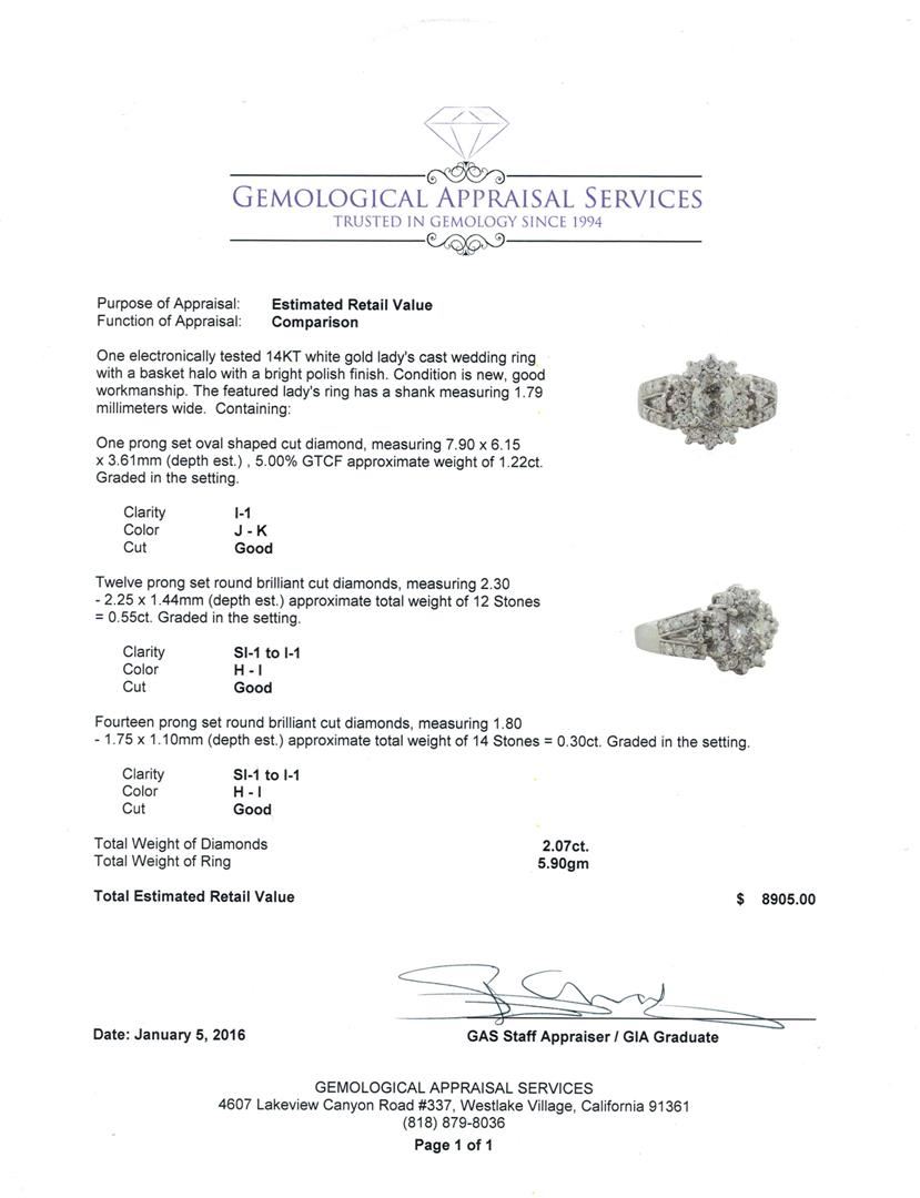 One electronically tested 14KT white gold lady's cast wedding ring with a basket halo with a bright polish finish. The featured lady's ring has a shank measuring 1.79 millimeters wide. Condition is new, good workmanship. Containing: One prong set oval shaped cut diamond, measuring 7.90 x 6.15 x 3.61mm (depth est.) , 5.00.%. GTCF approximate weight of 1.22ct. Graded in the setting. Clarity: I-1. Color: J - Good Twelve prong set round brilliant cut diamonds, measuring 2.30 - 2.25 x 1.44mm (depth est.) approximate total weight of 12 Stones = 0.55ct. Graded in the setting. Clarity: SI-1 to I-1. Color: H - I. Cut Good Fourteen prong set round brilliant cut diamonds, measuring 1.80 - 1.75 x 1.10mm (depth est.) approximate total weight of 14 Stones = 0.30ct. Graded in the setting. Clarity: SI-1 to I-1. Color: H - I. Cut Good. Total Weight of Diamonds 2.07ct. Total Weight of Ring 5.90gm. GAS Appraised at $8,905.00.