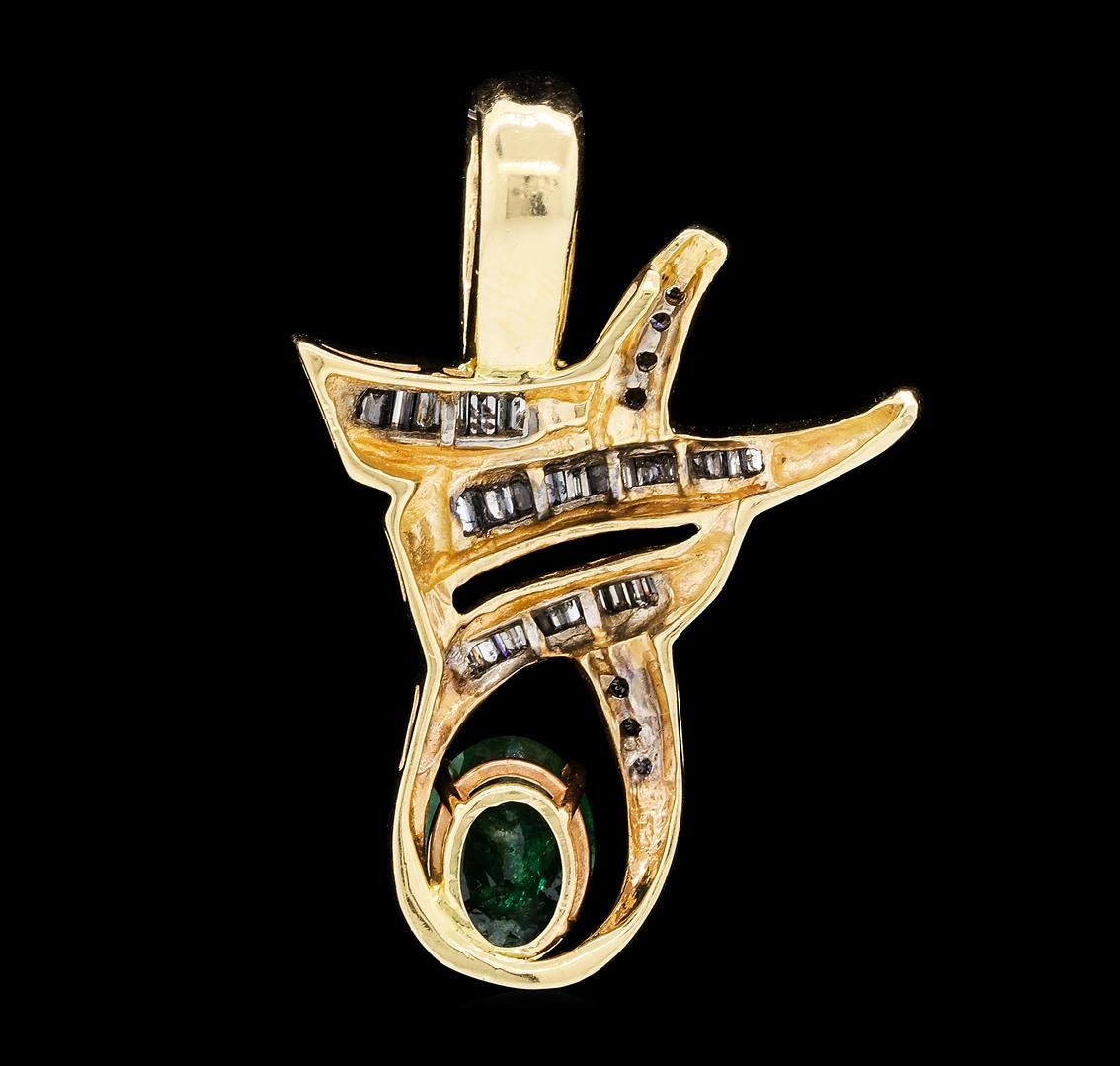 One electronically tested 14KT yellow gold lady's cast fashion pendant with a bright polish finish. Condition is like new, good workmanship. Containing: One prong set oval modified brilliant cut natural emerald, measuring 9.90 x 7.87 x 4.42mm, (depth est. GAS Appraised at $4,885.00.