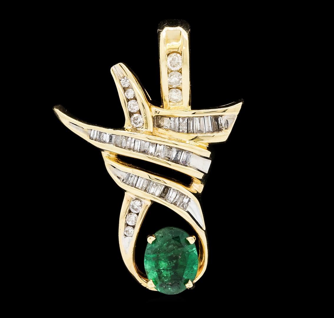 One electronically tested 14KT yellow gold lady's cast fashion pendant with a bright polish finish. Condition is like new, good workmanship. Containing: One prong set oval modified brilliant cut natural emerald, measuring 9.90 x 7.87 x 4.42mm, (depth est. GAS Appraised at $4,885.00.