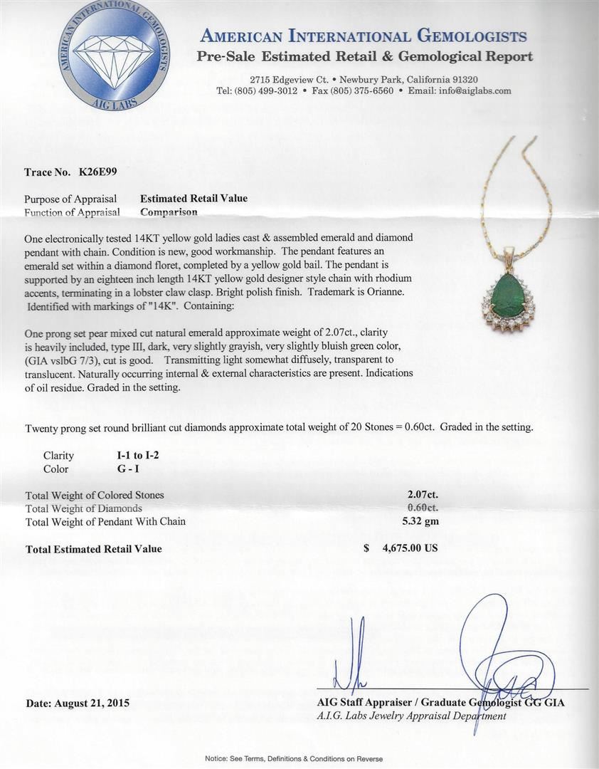 One electronically tested 14KT yellow gold ladies cast & assembled emerald and diamond pendant with chain. Condition is new, good workmanship. The pendant features an emerald set within a diamond floret, completed by a yellow gold bail. The pendant is supported by an eighteen inch length 14K yellow gold designer style chain with rhodium accents, terminating in a lobster claw clasp. Bright polish finish. Trademark is Orianne. Identified with marking of "14K". Containing: One prong set pear mixed cut natural emerald approximate weight of 2.07ct., clarity is heavily included, type III, dark, very slightly grayish, very slightly bluish green color, (GIA vs1bG 7/3), cut is good. Transmitting light somewhat diffusely, transparent to translucent. Naturally occurring internal & external characteristics are present. Indications of oil residue. Graded in the setting. Twenty prong set round brilliant cut diamonds approximate total weight of 20 Stones = 0.60ct. Graded in the setting. Clarity: I-1 to I-2. Color: G - I. Total Weight of Colored Stones: 2.07ct. Total Weight of Diamonds: 0.60ct. Total Weight of Pendant With Chain: 5.32gm. AIG Appraised at $4,675.00.
