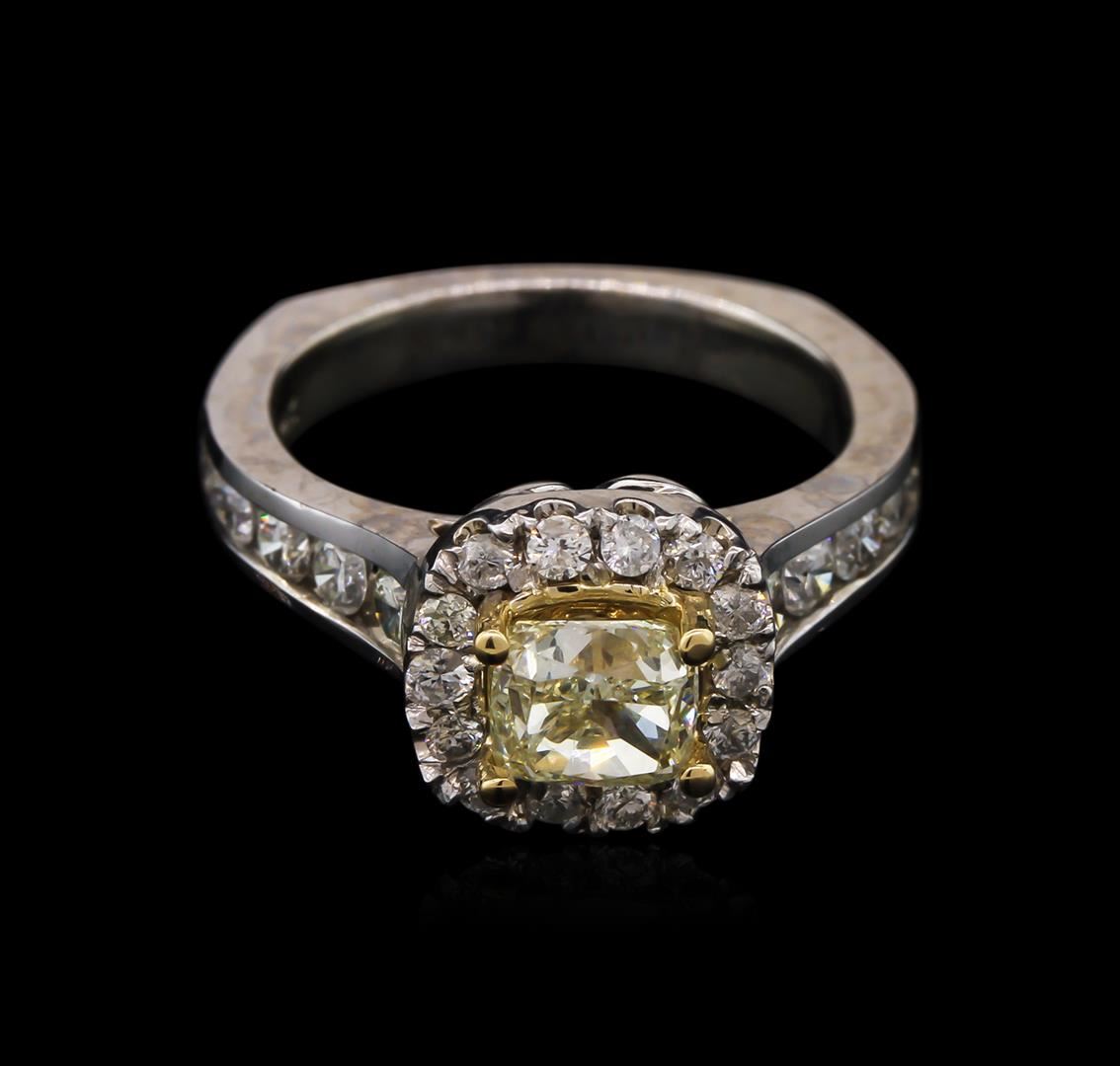 One electronically tested 14KT white gold ladies cast diamond ring with a bright polish finish. The featured diamond is set within an inner yellow gold basket and an outer diamond bezel supported by tapering diamond set shoulders, completed by a two and one-half millimeter wide band. Identified with markings of "14K". Condition is new, good workmanship. Containing: One cushion cut diamond, measuring 5.62 x 4.90 x 3.60mm, 13.00.%. GTCF exact weight 1.17ct. Graded in the setting. Clarity: VVS-2. Depth: 73.5%. Table 69.4%. Twenty-Four prong & channel set round brilliant cut diamonds, measuring 2.90 - 1.60 x 1.35mm exact total weight 24 Stones = 0.90ct. Graded in the setting. Clarity: SI-2 to I-1. Color: G - I. Total Weight of Diamonds 2.07ct. Total Weight of Ring 6.38gm. AIG Appraised at $10,600.00.