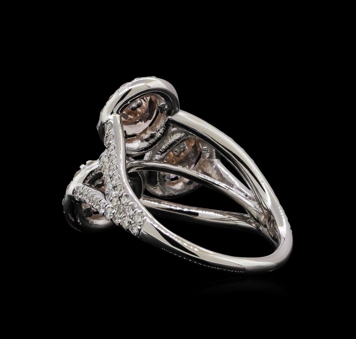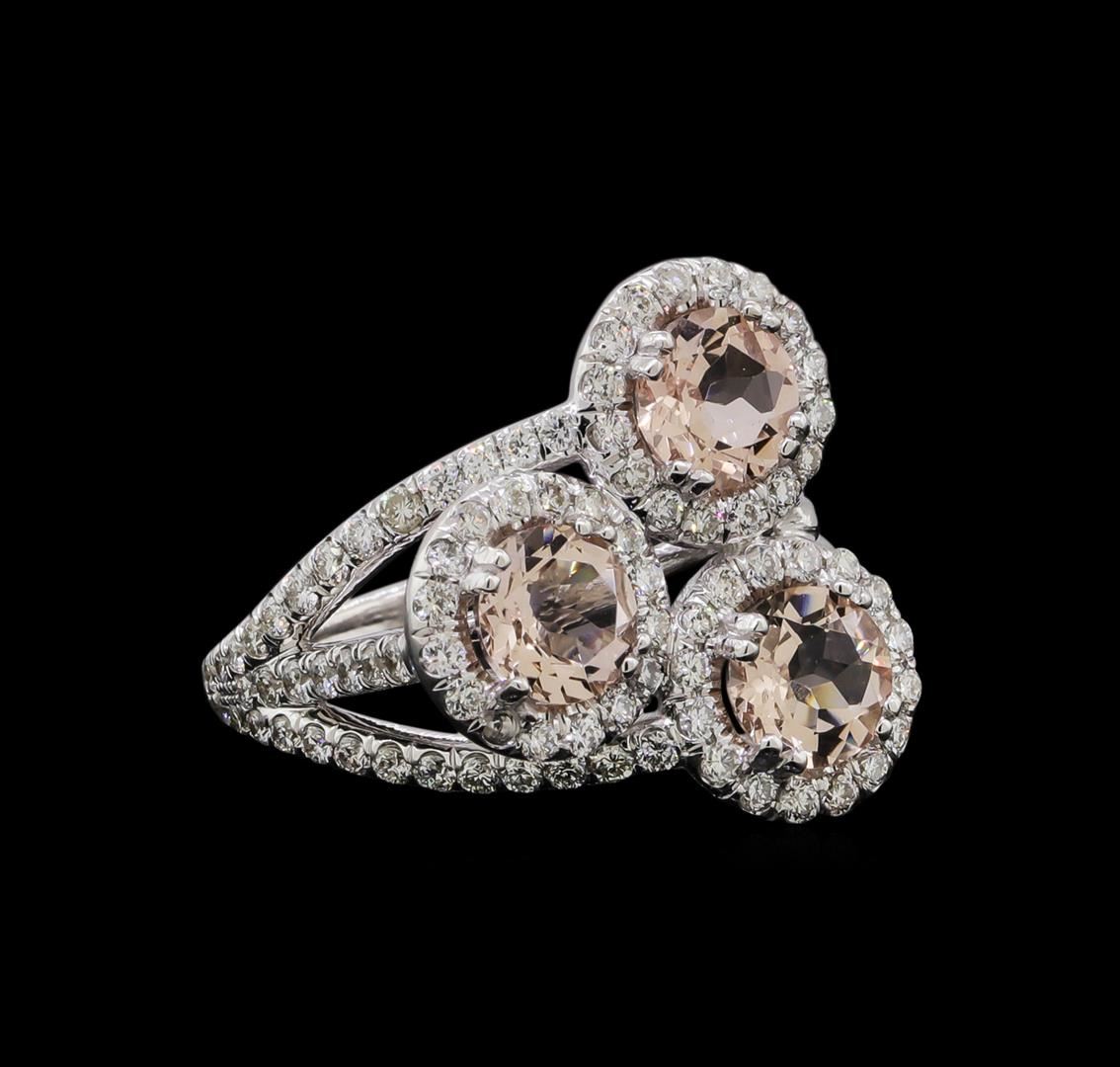 One electronically tested 14KT white gold ladies cast & assembled morganite and diamond ring with a bright polish finish. The ring features a cluster of three morganites set within diamond bezels supported by diamond set three-way split shoulders, completed by a one and one-half millimeter wide band. Identified with markings of '14K'. Condition is new, good workmanship. Containing: Three prong set round mixed cut natural morganites, measuring 6.00 - 6.00 x 3.50 mm, approximate total weight of 2.07ct., clarity is eye clean, type I, light, slightly brownish, red orange color, (GIA RO 3/2), cut is good. Transmitting light with no distortion, transparent. Measurements & the color grade are an average for the group. Graded in the setting. Eighty-Eight prong set round brilliant cut diamonds, measuring 1.50 - 1.50 x 0.90mm (depth est.) approximate total weight of 88 Stones = 1.16ct. Graded in the setting. Clarity SI-1 to I-1. Color: F - H Twenty-Three prong set round brilliant cut diamonds, measuring 1.40 - 1.20 x 0.78mm (depth est.) approximate total weight of 23 Stones = 0.20ct. Graded in the setting,. Clarity SI-1 to I-1. Color: F - H. Total Weight of Colored Stones 2.07ct.. Total Weight of Diamonds 1.36ct.. Total Weight of Ring 6.97gm. AIG Appraised at $6,440.00.