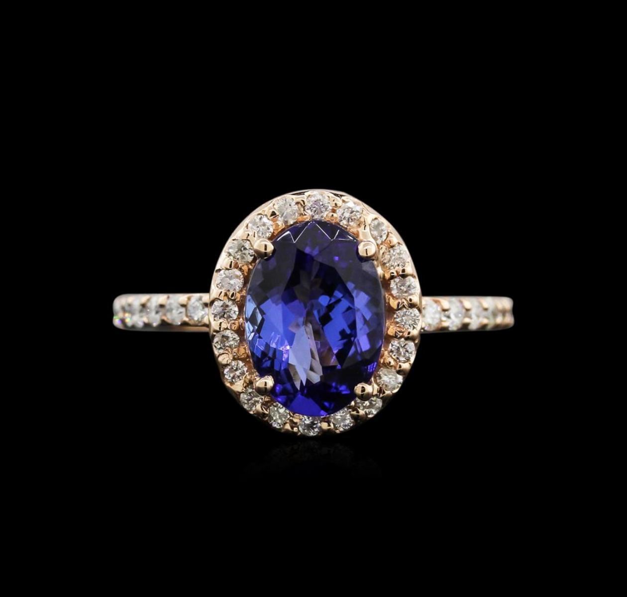 One electronically tested 14KT rose gold lady's cast fashion ring with a basket setting with a bright polish finish. The featured lady's ring has a halo motif with a shank measuring 1.72 millimeters in width. Identified with markings of "K14". Condition is new, good workmanship. Containing: One prong set oval modified brilliant cut natural tanzanite, measuring 10.01 x 7.10 x 4.33mm, approximate weight of 2.07ct., clarity is eye clean, type I, medium dark, very slightly grayish, violet color, (GIA V 6/3), cut is good. Transmitting light with no distortion, transparent. Colored gemstones are presumed to have been subjected to commonly used enhancement processes. Graded in the setting. Thirty-Two prong set round brilliant cut diamonds, measuring 1.50 - 1.45 x 0.96mm (depth est.) approximate total weight of 32 Stones = 0.43ct. Graded in the setting. Clarity: SI-2 to I-1. Color: H - I. Cut Good. Total Weight of Colored Stones 2.07ct. Total Weight of Diamonds 0.43ct. Total Weight of Ring 3.80gm. GAS Appraised.