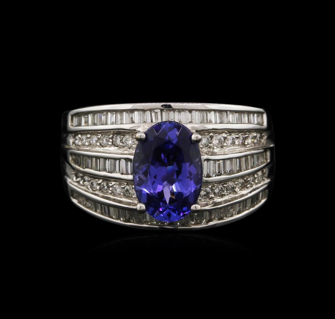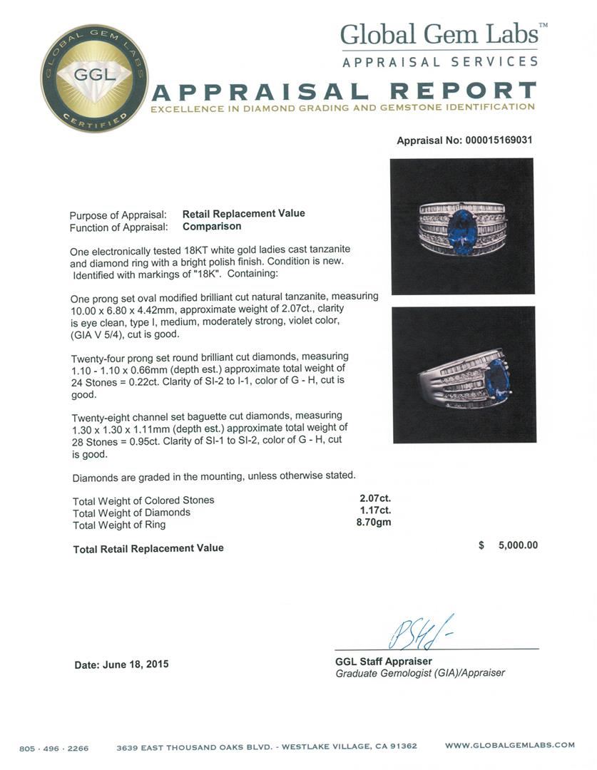 One electronically tested 18KT white gold ladies cast tanzanite and diamond ring with a bright polish finish. Identified with markings of "18K". Condition is new. Containing: One prong set oval modified brilliant cut natural tanzanite, measuring 10.00 x 6.80 x 4.42mm, approximate weight of 2.07ct., clarity is eye clean, type I, medium, moderately strong, violet color, (GIA V 5/4), cut is good. Twenty-Four prong set round brilliant cut diamonds, measuring 1.10 - 1.10 x 0.66mm (depth est.) approximate total weight of 24 Stones = 0.22ct. Clarity: SI-2 to I-1. Color: G - H, Cut is Good. Twenty-Eight channel set baguette cut diamonds, measuring 1.30 x 1.30 x 1.11mm (depth est.) approximate total weight of 28 Stones = 0.95ct. Clarity: SI-1 to SI-2. Color: G - H, Cut is Good. Diamonds are graded in the mounting, unless otherwise stated. Total Weight of Colored Stones 2.07ct. Total Weight of Diamonds 1.17ct. Total Weight of Ring 8.70 grams. GGL Appraised at $5,000.00.