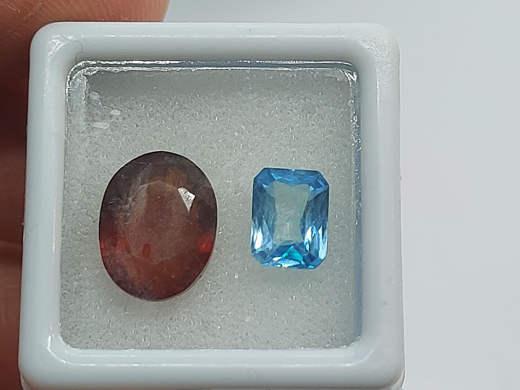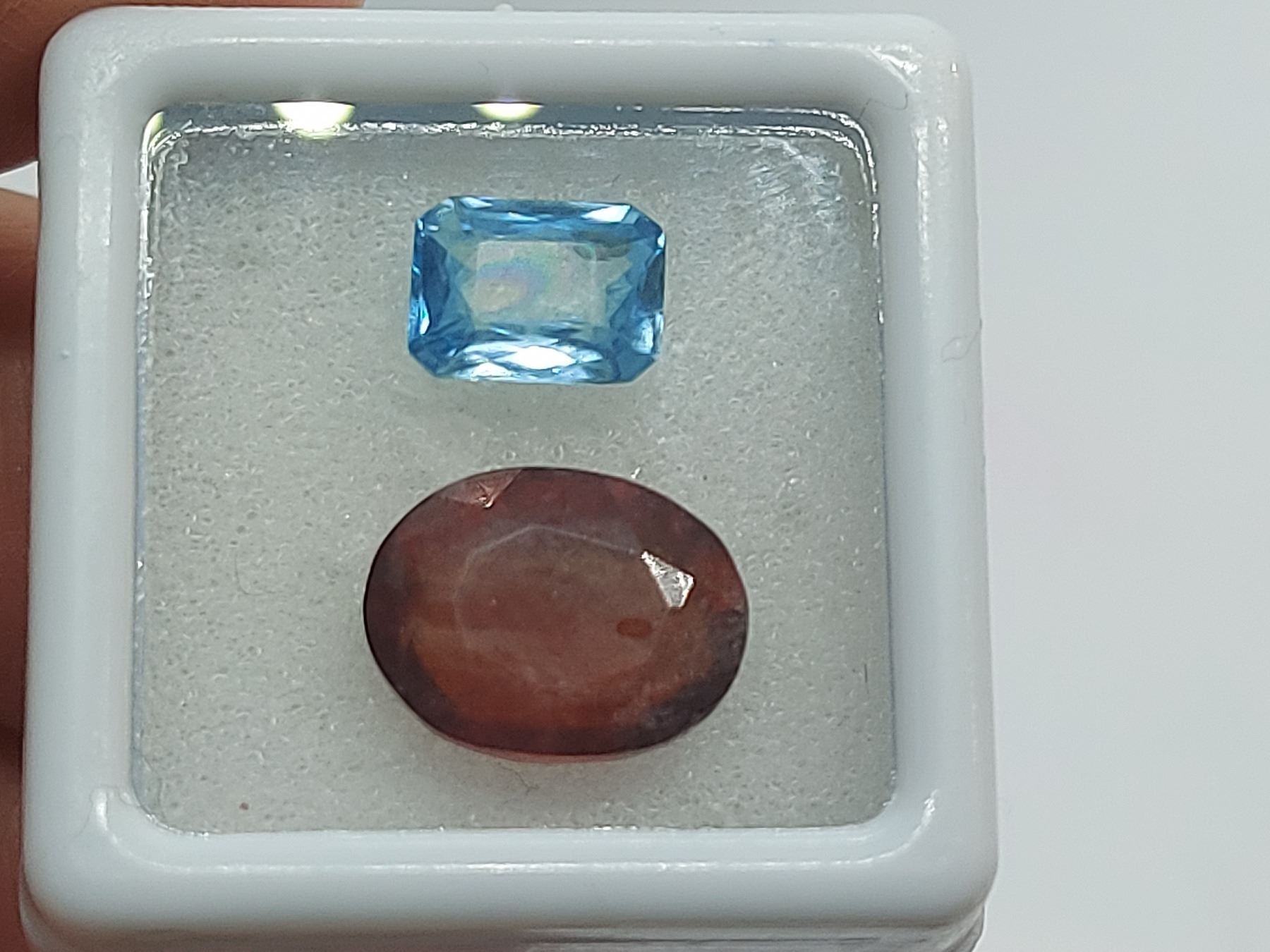 2.08 ct. TOPAZ 8.1 x 6.1 x 3.4 mm Colour: SKY BLUE, Shape: Emerald Cut, Clarity: VVS, Luster: Stunning, Origin: Brazil 6.53 ct. GARNET 12.08 x 9.48 x 5.82 mm Colour: DARK ORANGE, Shape: Oval Cut, Clarity: VS, Luster: Vitreous, Origin: India Unheated and Untreated