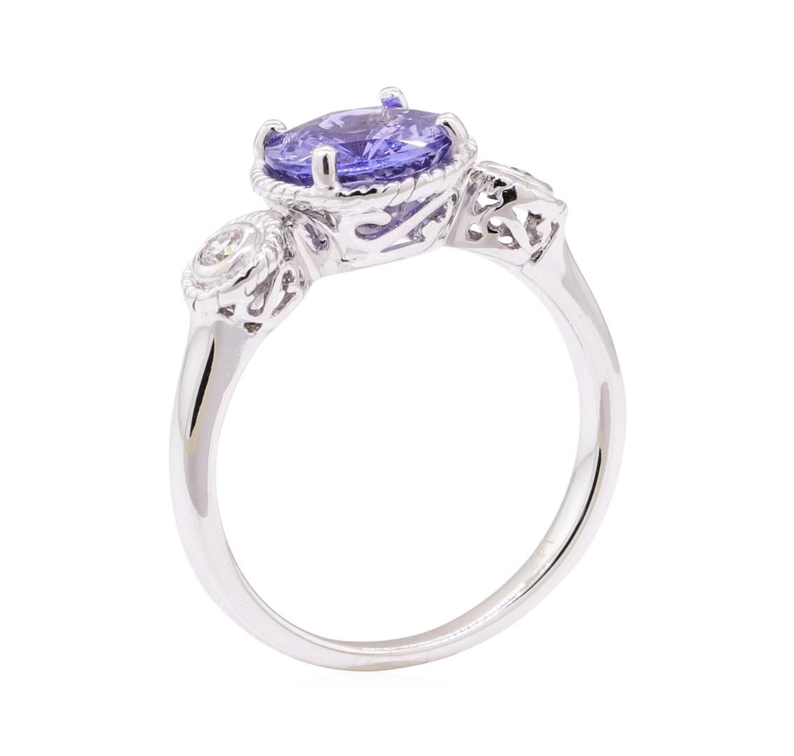 One ring featuring: 14KT white gold weighing 3.6 grams containing one blue sapphire weighing 1.96ct and diamonds weighing .12ctw. The ring has a 3-stone milgrain detailed motif.