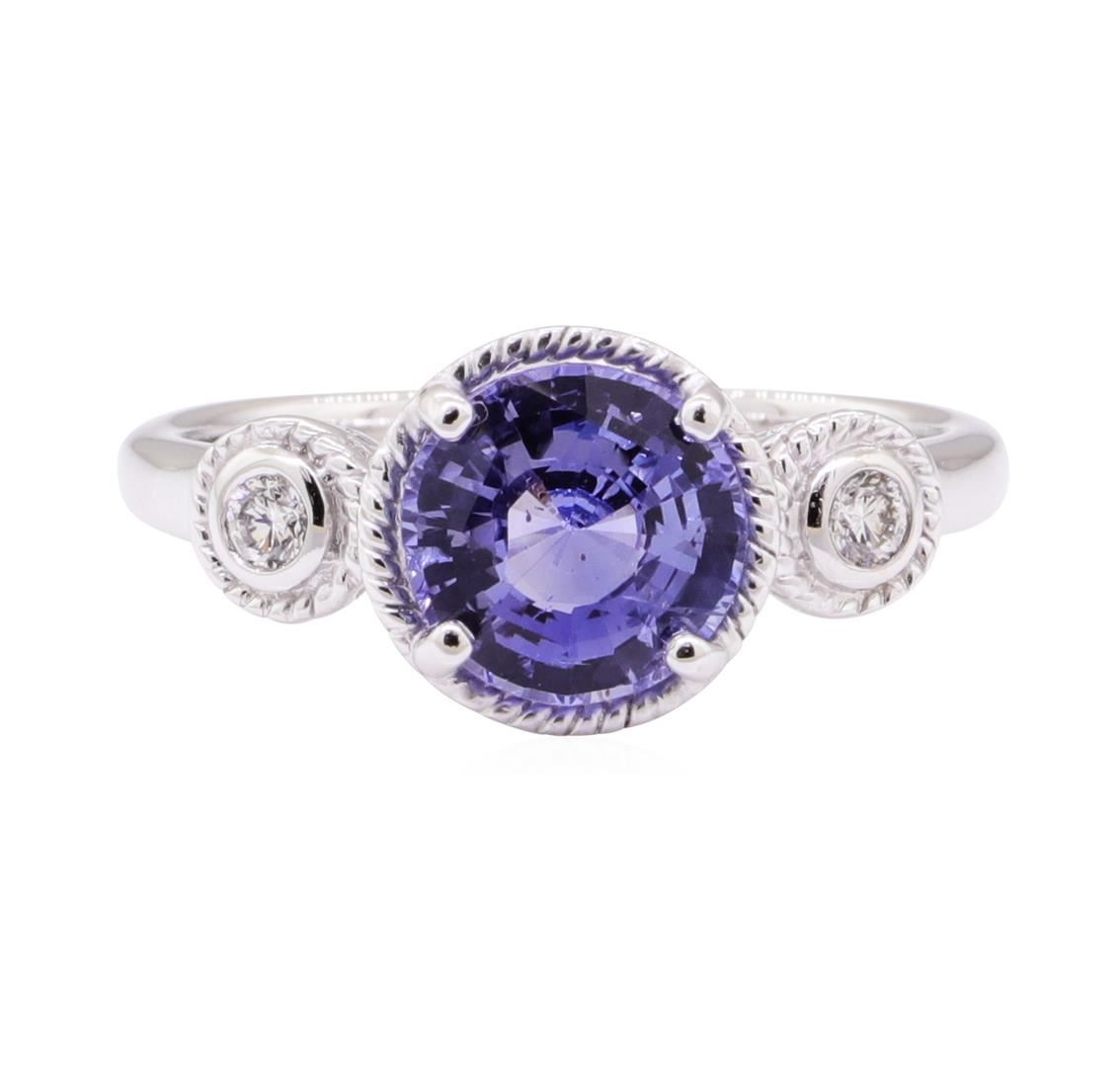 One ring featuring: 14KT white gold weighing 3.6 grams containing one blue sapphire weighing 1.96ct and diamonds weighing .12ctw. The ring has a 3-stone milgrain detailed motif.