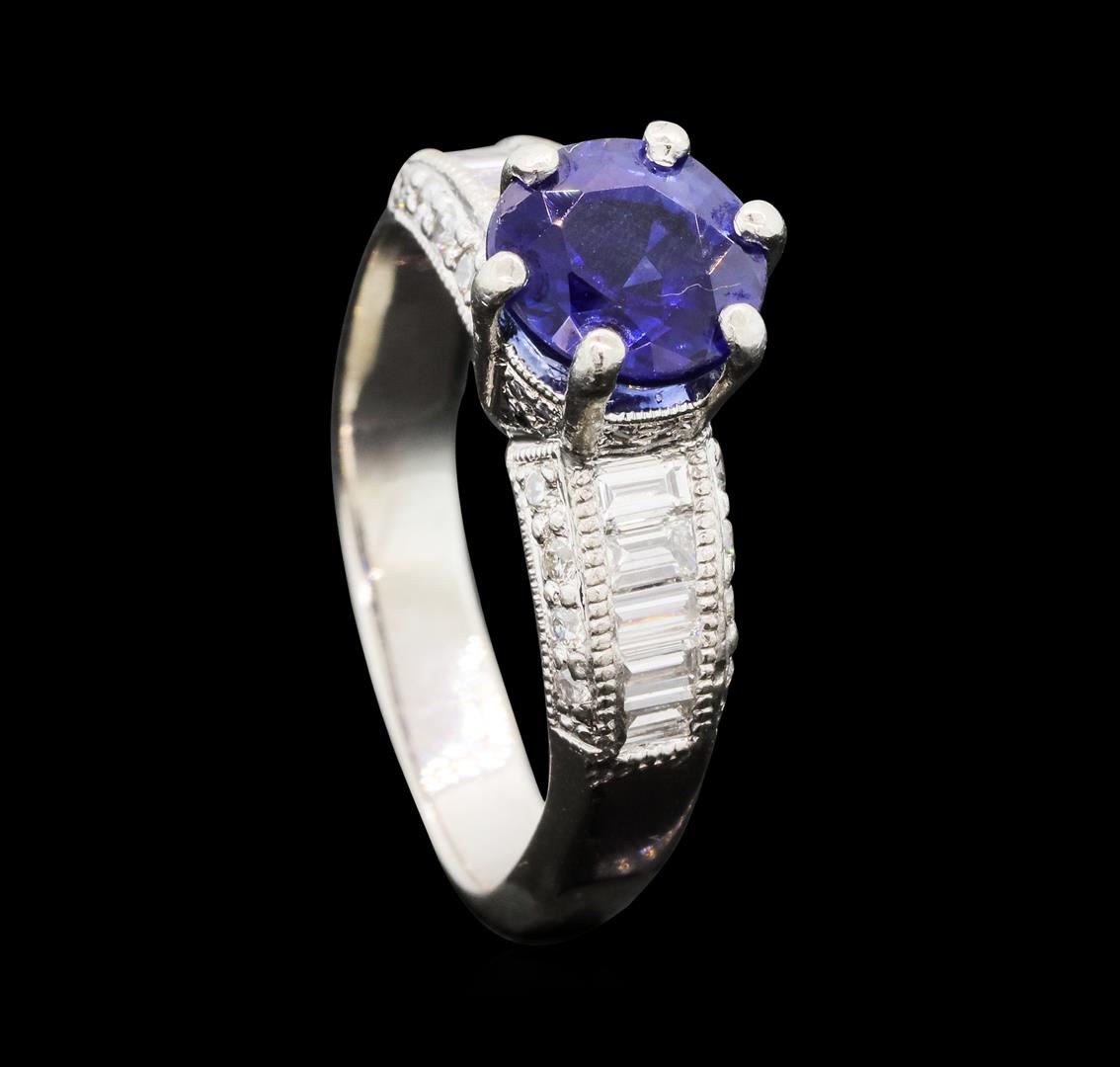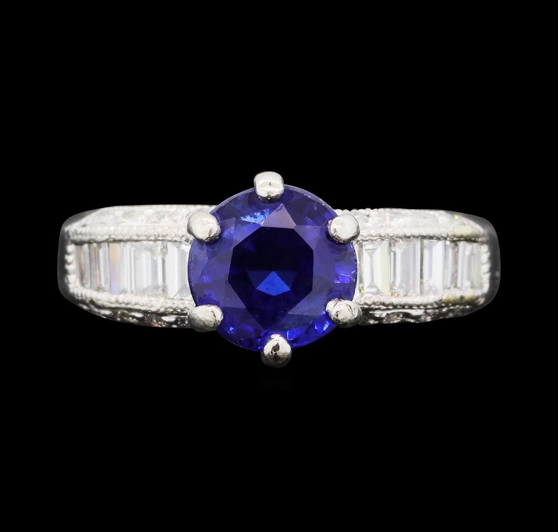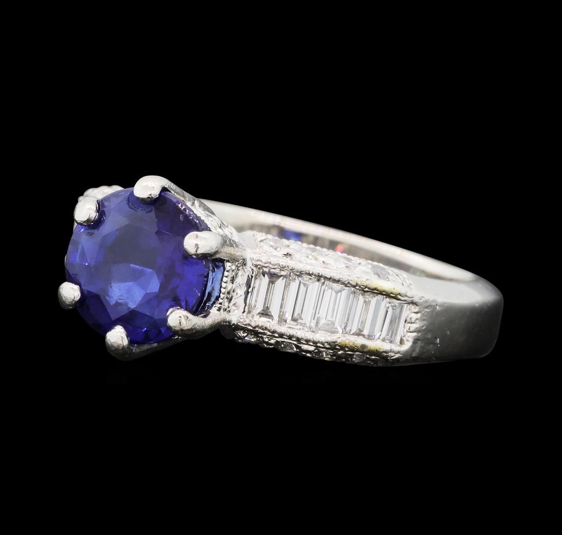One electronically tested platinum lady's cast fashion ring with a European shank with a bright polish with milgrain detailing finish. The featured lady's ring has a shank measuring 3.43 millimeters wide. Identified with markings of 'PLAT'. Condition is new, good workmanship. Containing: One prong set round modified mixed cut natural blue sapphire, measuring 7.25 - 7.20 x 4.49 mm, (depth est.) 10%. bulge factor, approximate weight of 2.08ct., clarity is eye clean, medium dark, strong, blue color, (GIA B 6/5), cut is very good. Transmitting light with no distortion, transparent. Colored gemstones are presumed to have been subjected to commonly used enhancement processes. Graded in the setting. Ten channel set baguette cut diamonds, measuring from 2.35 x 1.25 x 1.07mm (depth est.) to 2.60 x 1.50 x 1.28mm (depth est.) approximate total weight of 10 Stones = 0.37ct. Graded in the setting. Color F - G Clarity VS-1 to VS-2 Cut Very Good Sixteen prong set round brilliant cut diamonds, measuring 1.30 - 1.20 x 0.78mm (depth est.) approximate total weight of 16 Stones = 0.12ct. Graded in the setting. Color G - H Clarity VS-2 to SI-1 Cut Good Sixteen prong set round brilliant cut diamonds, measuring 0.90 - 0.80 x 0.53mm (depth est.) approximate total weight of 16 Stones = 0.04ct. Graded in the setting. Color G - H Clarity VS-2 to SI-1 Cut Good. Total Weight of Colored Stones 2.08ct.. Total Weight of Diamonds 0.53ct.. Total Weight of Ring 7.20gm GAS Appraised at $9,080.00.