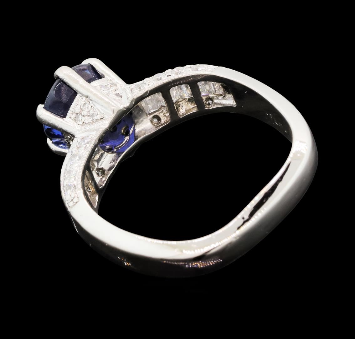 One electronically tested platinum lady's cast fashion ring with a European shank with a bright polish with milgrain detailing finish. The featured lady's ring has a shank measuring 3.43 millimeters wide. Identified with markings of 'PLAT'. Condition is new, good workmanship. Containing: One prong set round modified mixed cut natural blue sapphire, measuring 7.25 - 7.20 x 4.49 mm, (depth est.) 10%. bulge factor, approximate weight of 2.08ct., clarity is eye clean, medium dark, strong, blue color, (GIA B 6/5), cut is very good. Transmitting light with no distortion, transparent. Colored gemstones are presumed to have been subjected to commonly used enhancement processes. Graded in the setting. Ten channel set baguette cut diamonds, measuring from 2.35 x 1.25 x 1.07mm (depth est.) to 2.60 x 1.50 x 1.28mm (depth est.) approximate total weight of 10 Stones = 0.37ct. Graded in the setting. Color F - G Clarity VS-1 to VS-2 Cut Very Good Sixteen prong set round brilliant cut diamonds, measuring 1.30 - 1.20 x 0.78mm (depth est.) approximate total weight of 16 Stones = 0.12ct. Graded in the setting. Color G - H Clarity VS-2 to SI-1 Cut Good Sixteen prong set round brilliant cut diamonds, measuring 0.90 - 0.80 x 0.53mm (depth est.) approximate total weight of 16 Stones = 0.04ct. Graded in the setting. Color G - H Clarity VS-2 to SI-1 Cut Good. Total Weight of Colored Stones 2.08ct.. Total Weight of Diamonds 0.53ct.. Total Weight of Ring 7.20gm GAS Appraised at $9,080.00.